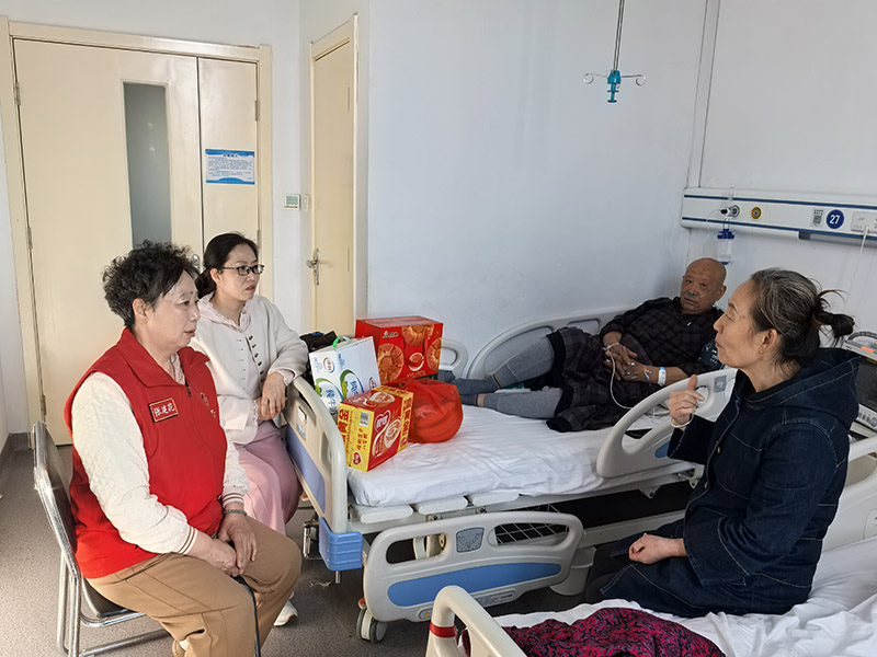 张宝山,利他义工之家的一名志愿者,也是志愿者任迎兰的爱人。 5月8号下午张宝山突然感觉胸闷,呼吸困难,到医院后确诊心力衰竭。 5月10日下午,利他义工之家党支部书记杜同会、秘书长吴静如、副队长张建花代表团队前往医院,探望了正在住院期间的志愿者张宝山,送去了团队的关怀与温暖。