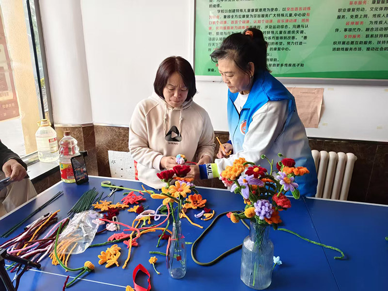 虽然有些成员是初次接触手工编织,但在母亲们的鼓励和帮助下,慢慢地也掌握了窍门。她们的指尖在毛线间穿梭,朵朵花瓣,片片绿叶都凝聚着对母亲浓浓的爱意。母亲们则在一旁笑容满面的享受着与孩子一起编织的美好时光,现场充满了欢声笑语和温馨的交流声。 经过大家的共同努力,一朵朵栩栩如生,颜色鲜艳的毛线编织康乃馨逐渐成型。那娇艳欲滴的花朵,仿佛是大家心底对母亲爱的具象化表达。随后,团队成员禹丽娜将亲手编织的康乃馨郑重地送给自己的婆婆,同时送出的也是媳妇对妈妈满满的爱,其他家属妈妈也同样收到了队员们送去的节日温暖。