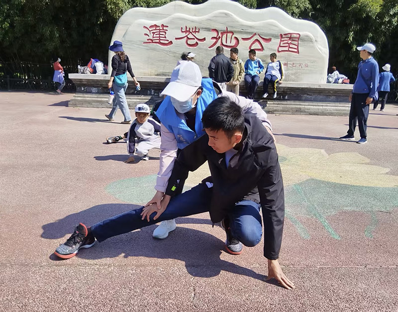 在第35个全国助残日这一特殊的日子里,狂风呼啸,却未能阻挡一群心怀大爱的人奔赴一场温暖的约定。大家相聚在莲花池公园,这里承载着无数希望与爱,见证着对 “星星” 孩子运动陪伴计划最诚挚的践行。 “星星” 的孩子们,如同夜空中独自闪烁的星辰,他们沉浸在自己的世界里,需要我们用更多的耐心、爱心去靠近、去陪伴。这场特殊的约定,远不止是一次简单的相聚,它是一份庄重的承诺,是对 “不被风雨吹散的温暖” 最生动的诠释。在与 “星星” 孩子相处的过程中,志愿者们的每一个动作都饱含深情。从脚到头的拉伸辅助,那是细致入微的关怀,每一次轻轻的触碰,都传递着无尽的温柔,仿佛在告诉孩子们:“我们一直都在。” 跑步时,志愿者们紧紧跟在 “星星” 孩子身旁,他们的陪伴不是简单的跟随,而是一种力量的传递。当 “星星” 孩子步伐不稳时,志愿者们会及时伸出援手;当孩子们想要放弃时,志愿者们会用鼓励的眼神和话语给予他们坚持下去的动力。这些看似平常的瞬间,都是志愿者与 “星星” 孩子共同成长的珍贵见证。