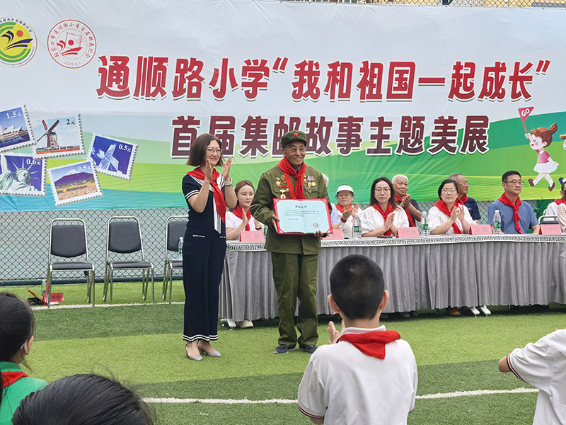 6月26日,由桥西区通顺路小学主办的“我和祖国一起成长”首届集邮故事主题美展,特邀了福德仁爱公益队爱国主义教育负责人李书庭到现场进行爱国主义教育,并且讲述了邮票中的革命故事,为通顺路小学自费购买并捐赠了100套“我和祖国一起成长”的纪念邮票。通顺路小学校长韩雅静亲自为李书庭颁发了捐赠证书。