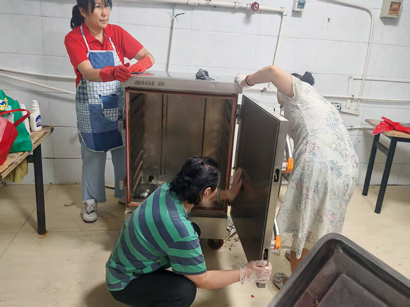 抵达现场后,志愿者们迅速投入工作。面对厨房内待清理的灶具,大家分工协作、有条不紊。有的仔细擦拭灶台油污,有的认真清洗锅碗瓢盆,有的专注检查灶具功能……大家不怕脏,不怕累,灶具虽然油腻很重,但志愿者们毫不畏惧,用勤劳的双手,一遍一遍的搽洗,双手被清洁剂浸得有些发红,但每个人的脸上都洋溢着热情与专注。赈灾保障工作容不得半点马虎,厨房灶具是后勤保障的重要一环,干净整洁的环境才能让一线人员吃得放心、用得安心。