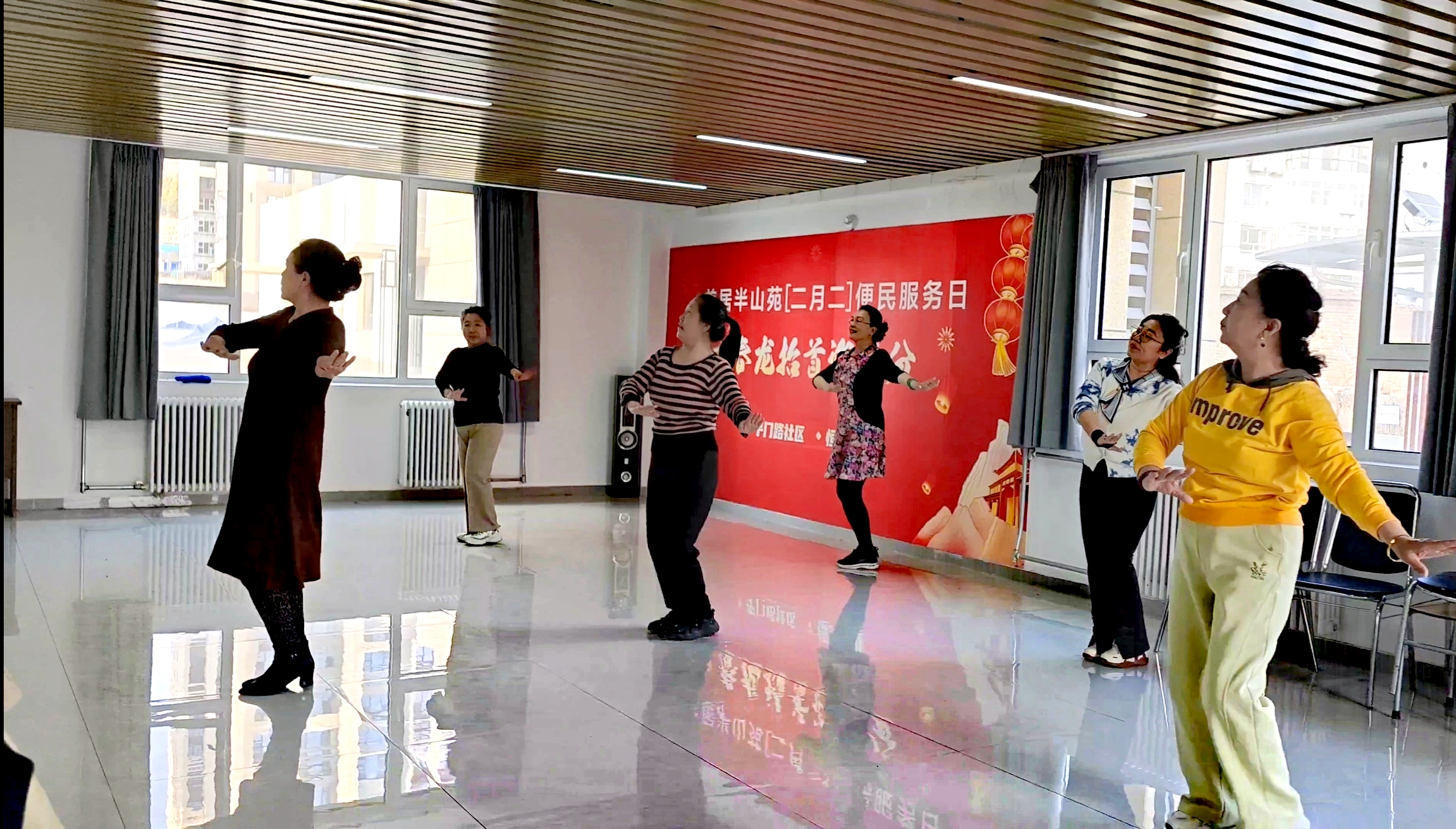 参与活动的银龄队员们个个精神饱满、热情高涨,丝毫没有因年纪增长而显露懈怠,全程专注投入、认真练习,展现出极强的学习积极性。伴随着悠扬又激昂的音乐旋律,大家缓缓舒展身姿,跟着老师的节奏一遍遍揣摩动作细节,反复磨合舞步与音乐的配合。遇到不懂的地方,队员们主动举手向老师请教,身边的伙伴们也纷纷伸出援手,互相纠正动作、交流学习心得,你帮我捋手势,我帮你找节奏,团结友爱的学习氛围深深感染着在场每一个人。即便练习过程中有些疲惫,队员们也始终坚持,凭借着认真的态度和彼此间的默契配合,很快便熟练掌握了舞蹈的核心动作与整体编排。整齐划一的舞步、深情真挚的演绎,队员们将对祖国的无限热爱、对美好生活的感恩,全都融入每一个舞姿之中,生动展现出新时代老年群体乐观向上、心系家国的良好精神面貌。