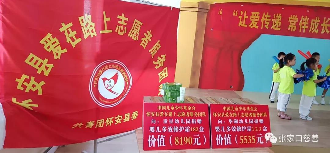 为了唤起孩子内心爱的情感,把爱的种子播进孩子的心田,培养孩子用爱心创造美好的世界,由张家口慈善义工联合会对接中国儿童少年基金会的幼儿修护霜项目落地怀安县。2019年7月14日,怀安县“爱在路上”志愿者服务团队在团县委的组织和张家口慈善义工联合会的支持下开展“让爱传递,常伴成长”的活动向怀安县童星幼儿园、华澜幼儿园、宝贝家幼儿园、文苑幼儿园捐赠由中国儿童少年基金会提供的价值27000元的幼儿多效修复霜 。共青团怀安县委副书记冯会东出席活动。
