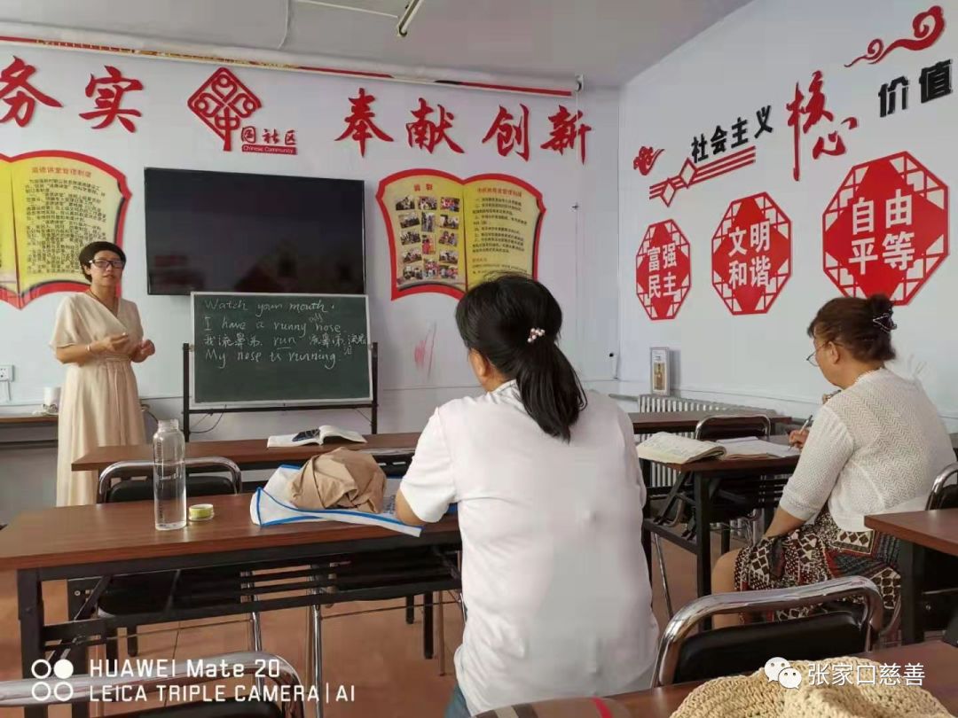 右一为侯宝存老师 一、英语培训班在东河沿社区进行 2019年7月18日上午,冬奥英语老年志愿服务队英语培训班在东河沿社区进行第176次活动。侯宝存讲英语俚语Break a leg,英语形容词性的物主代词,大家进行了充分的练习,反映不错。