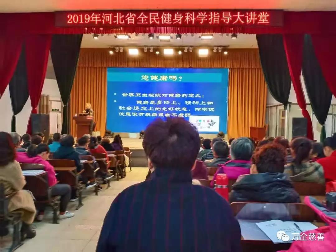 为普及养生健康知识,开展全民养生知识宣传。2019年11月7日上午,万全区教育和体育局主办的全民健康科学指导大讲堂在万全区职教中心礼堂举办,由河北省体育局特邀请运动人体科学、运动医学、运动康复学等相关领域专家授课。