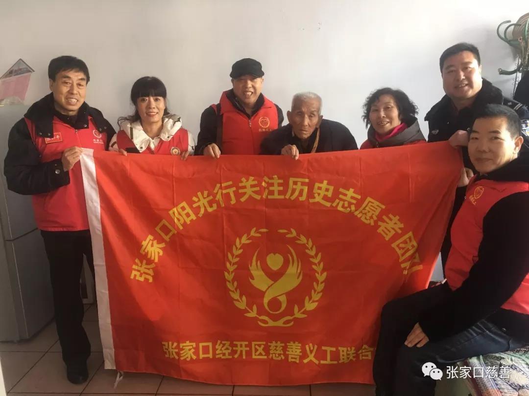 阳光行关注历史志愿者团队是张家口慈善义工联合会弘扬红色文化的一支特色义工队,也是经开区义工联的成员单位,他们专门慰问参加了抗日战争、解放战争、抗美援朝战争的,从烽火硝烟中走来的革命老兵,为这些老革命送去来自民间组织的感恩与关心,同时抢救性收集这些老兵的战场经历和革命故事,丰富弘扬爱国主义和红色文化的资料准备工作,并把红色文化带进校园、企业。