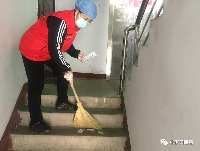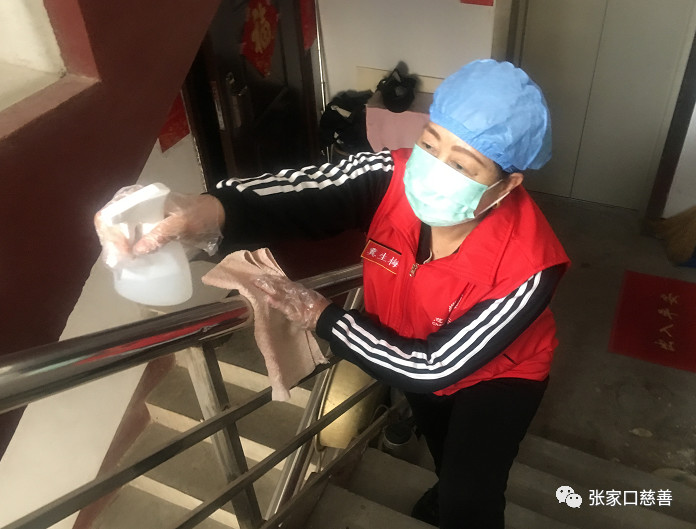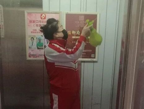 冀生梅队长、崔荣霞在楼宇门、楼道、电梯喷洒消毒液