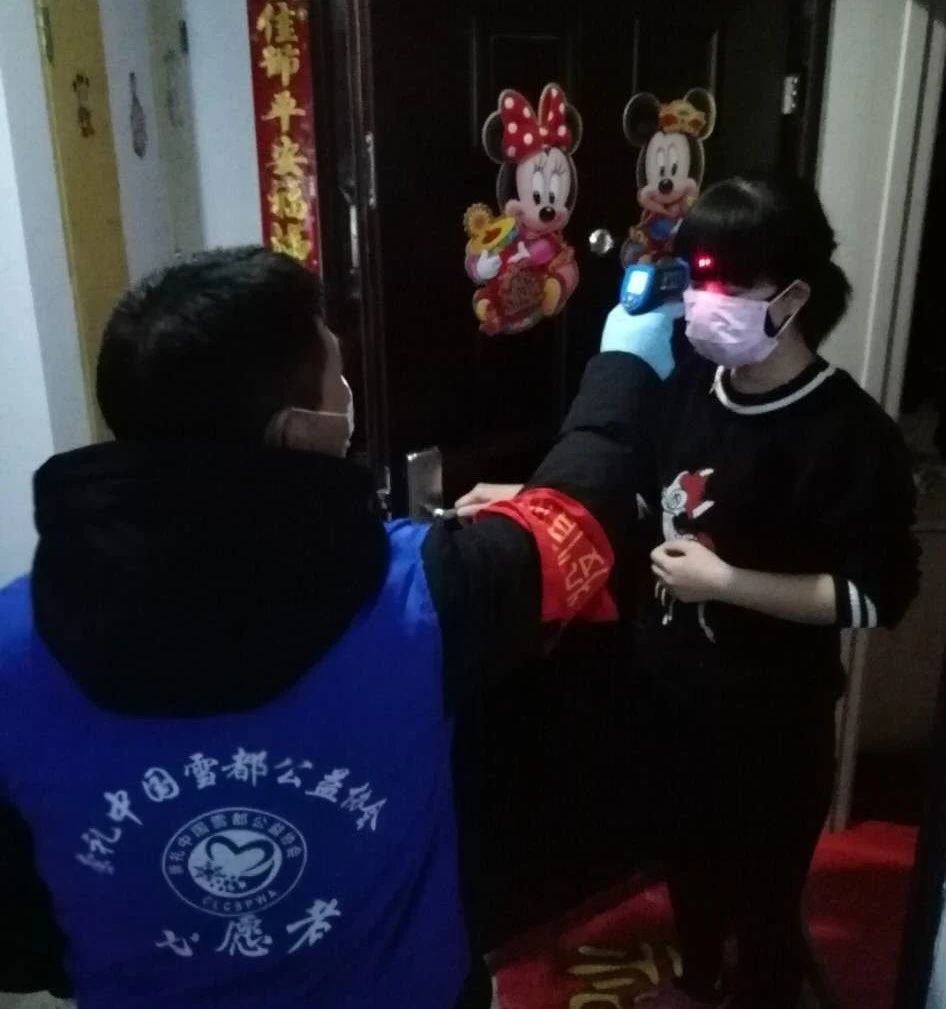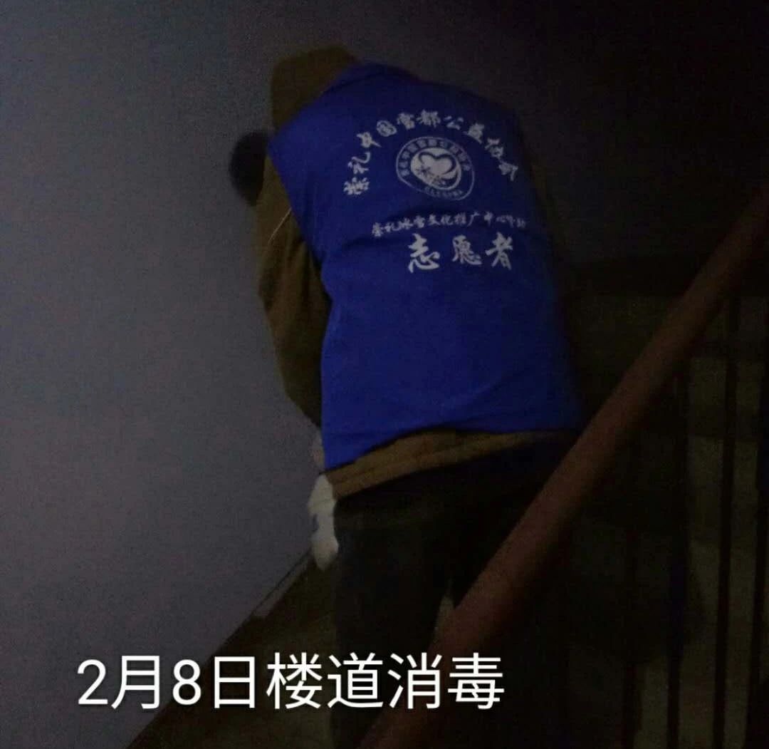 2020年2月8日,5名志愿者纷纷报名,分组分班的到崇礼区物质小区、机械厂家属楼、傅顿庄园等喷撒消毒液。疫情出现以来,8名志愿者参加疫情防控职守和排查入户小区的疫情防控值守工作,至今每天工作达6小时以上。