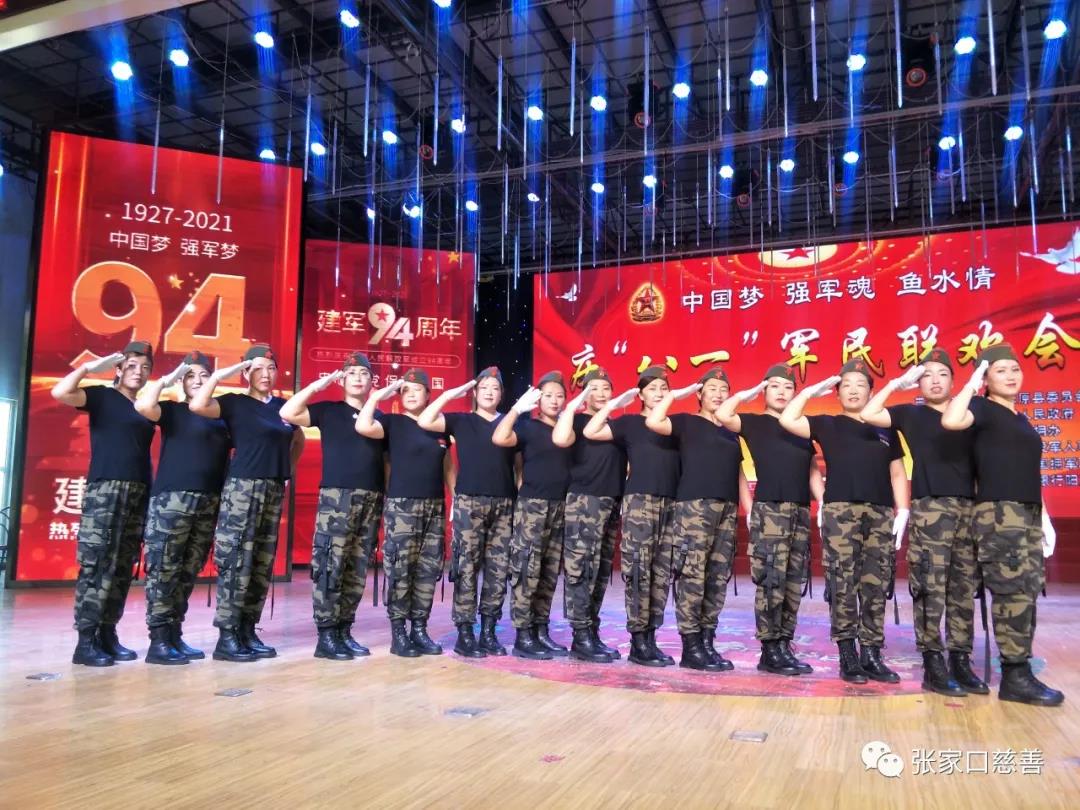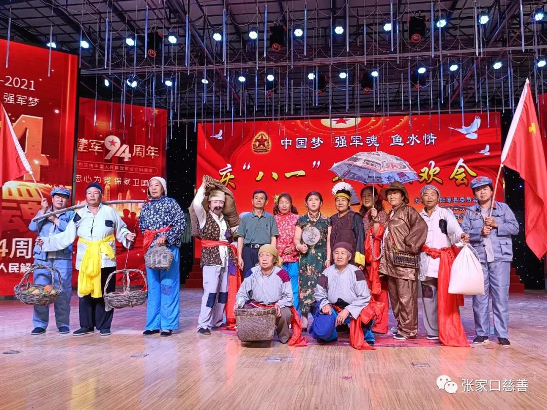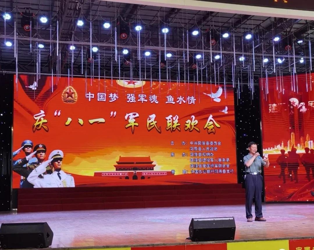 在中国人民解放军建军94周年来临之际,阳原县爱国拥军联合会于2021年7月30日,在阳原县职教中心举办“中国梦、强军魂、鱼水情庆八一军民联欢会”,阳原县爱国拥军联合会会长田广阔一曲《咱当兵的人拉开序幕,接着有舞蹈《当兵就是那么帅》,情景剧《不忘阶级苦》等节目演出,参加的舞蹈队有泥河湾晨练队、玉清炫舞队、欢聚一堂舞蹈队、火焰舞蹈队、健康快乐舞蹈队、乐呵呵舞蹈队等100多人参加,还有退役军人、退役军人家属、阳原县爱国拥军联合会志愿者欢聚一堂,在中国人民解放军建军94周年,向为我们保家卫国的全体解放军战士,致以诚挚的问候和节日的祝贺。