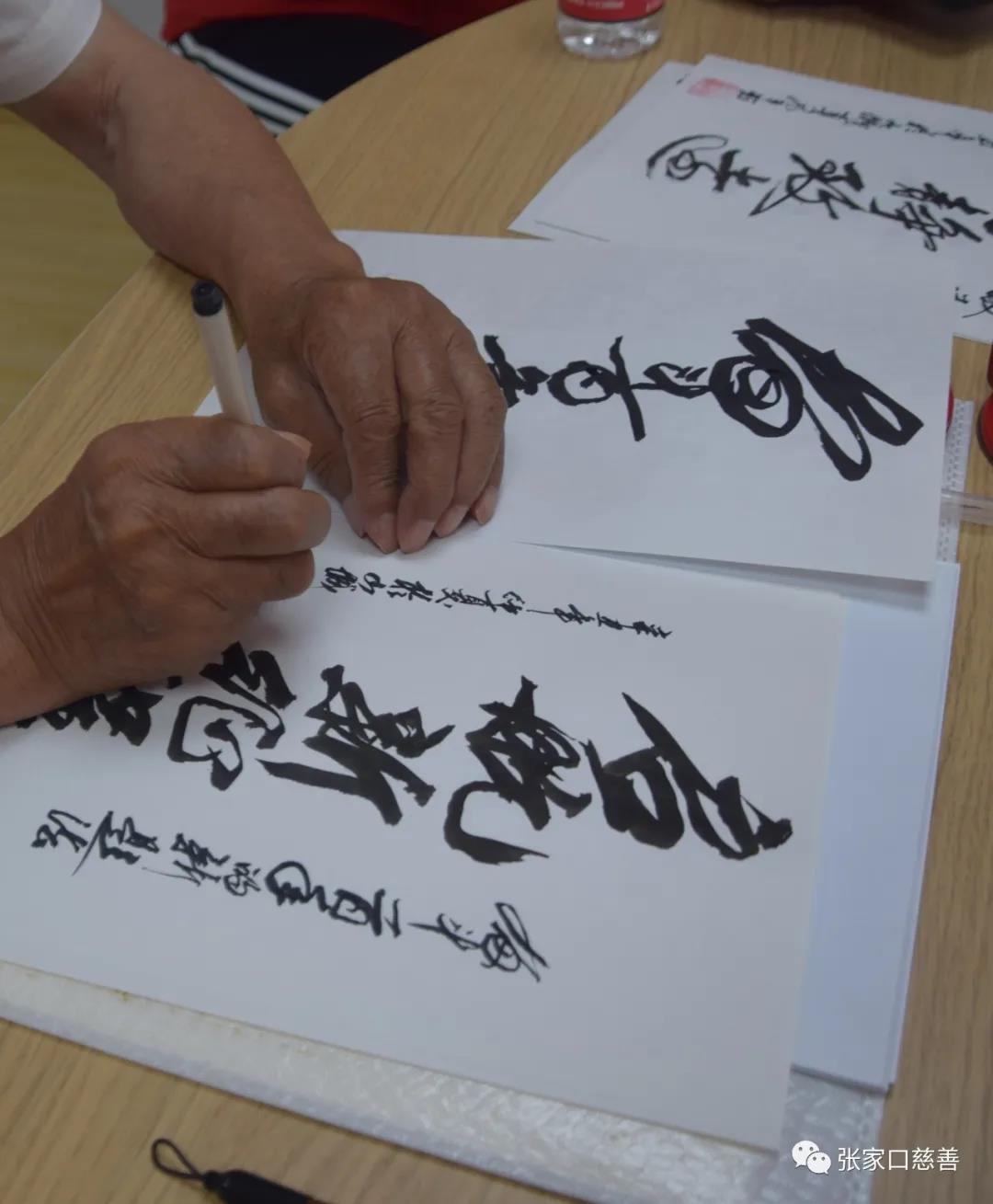 新声场黄主任公益队队员发言 扶贫干部退伍军人老党员陈锋胜谈到:我作为党的干部,必须感恩我们的党,没有中国共产党,就没有我们现在的幸福生活。我是河南人,这次全国人民支援河南,张家口慈善义工联合会也出动了20名志愿者逆行河南,体现了我们的党是全心全意为人民的党,是把人民的利益放在第一位的党。我们由于年龄的原因,虽然不能亲自支援河南灾区,但是我们还要行动起来,参加到公益事业上来,为社会做更多的事情,这样才不愧我们这个时代赋予我们的使命。多做公益,多为人民服务,多激发正能量,就是对河南的支持,就是对国家的贡献。茶话会上,八十多岁的樊教授亲自为大家写了“奋斗百年路,起航新征程”等二十多幅书法绘画作品。