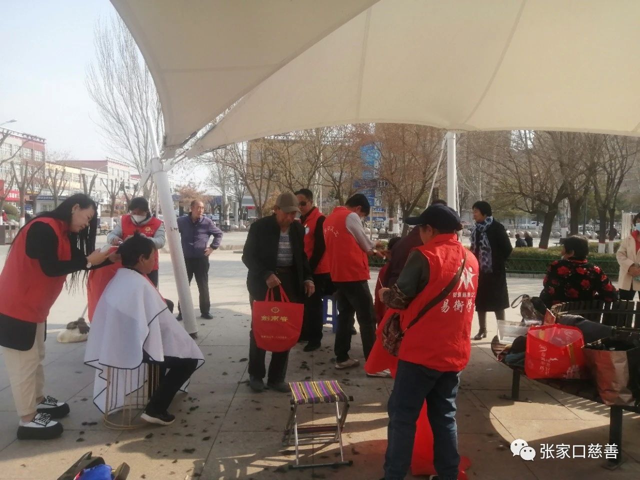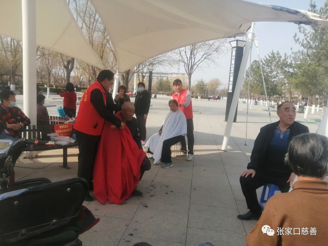 3月30日星期四天气很暖,雷锋理发队在阳原县泥河湾文化广场展开义务理发活动。