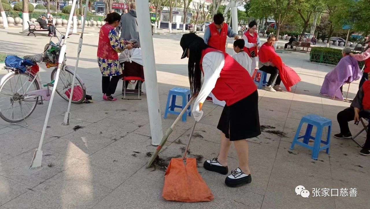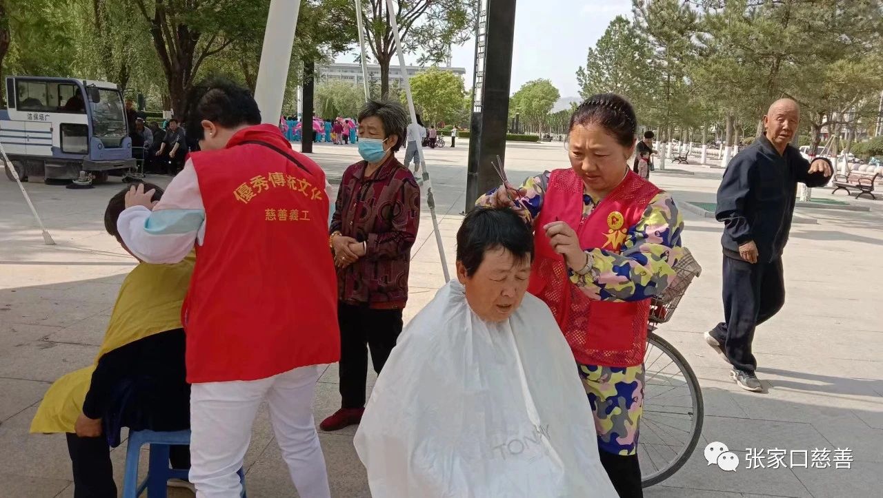 5月18日星期四下午,泥河湾广场。阳原雷锋理发队五名志愿者,春风送暖爱心团队二名志愿者,两队共七名志愿者在广场东南角白色布凉篷下给前来等待的老人们义务理发。带队的是两位队长王文顺和刘忠。