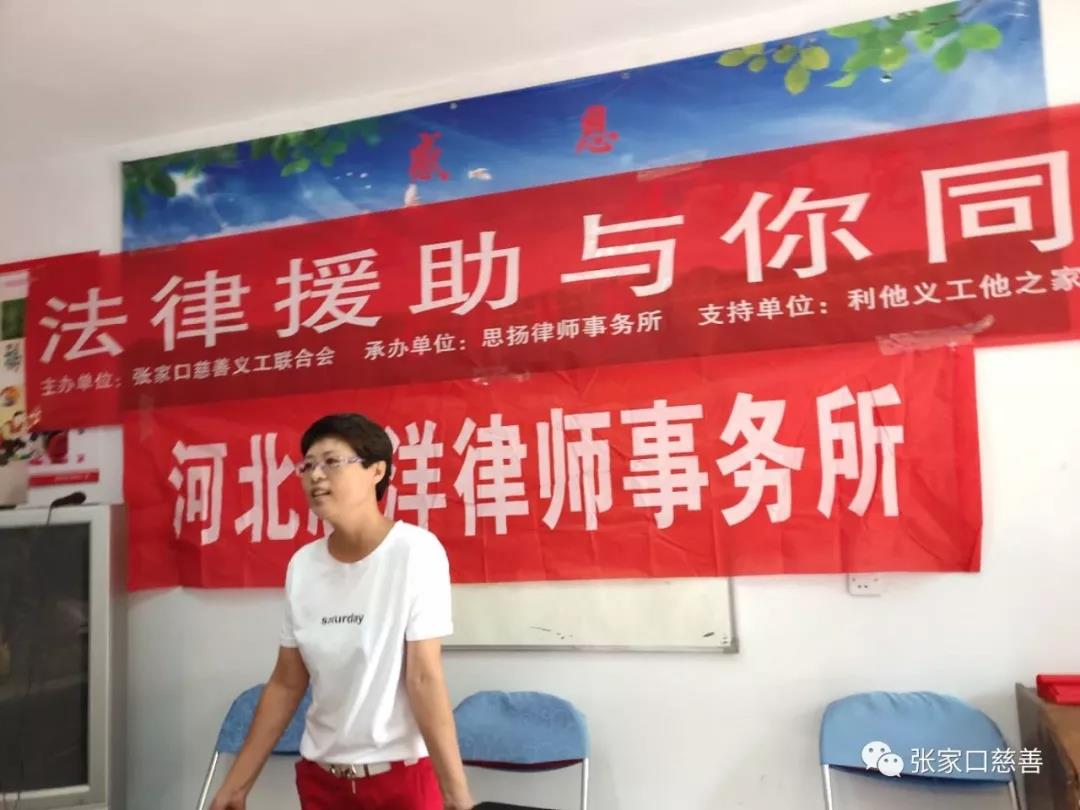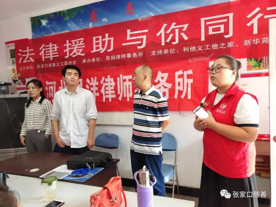 为更好地贯彻落实《法律援助条例》的根本要求,进一步弘扬法治精神,为依法治国提供有力的支持和坚实的群众基础。为此于8月26日上午9点由张家口慈善义工联合会携手思扬律师事务所在利他义工之家活动室共同举办“法律援助与你同行”并由利他义工之家义工志愿者和新华苑社区人员参加的一场普法宣传活动。