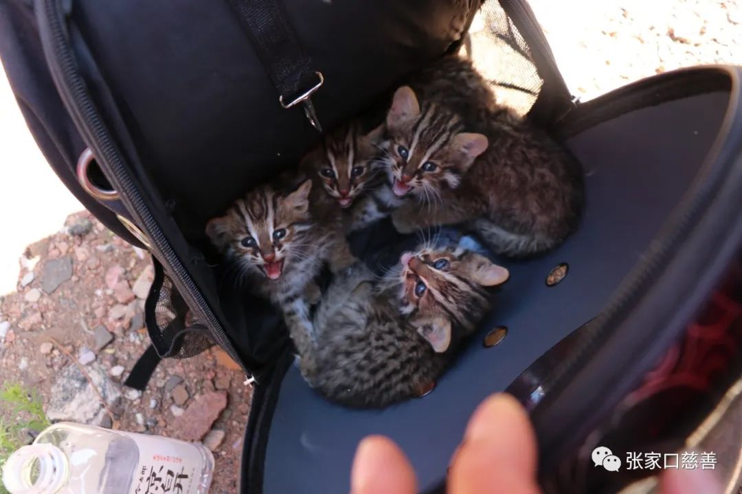 两个月前,泥河彩玉志愿者服务队受阳原自然资源和规划局委托去揣骨疃政府救助豹猫,因周围施工,豹猫妈妈被惊走,还未睁眼的幼猫们可怜无助,尚不具备野外生存能力,只能人工喂养,服务队将其救助后带回宠物医院,在阳原检察院监督下,本服务队的专业兽医米佳晨精心照顾豹猫们50多天 ,现在它们精神状态良好,已有野外生存能力,具备放生条件。