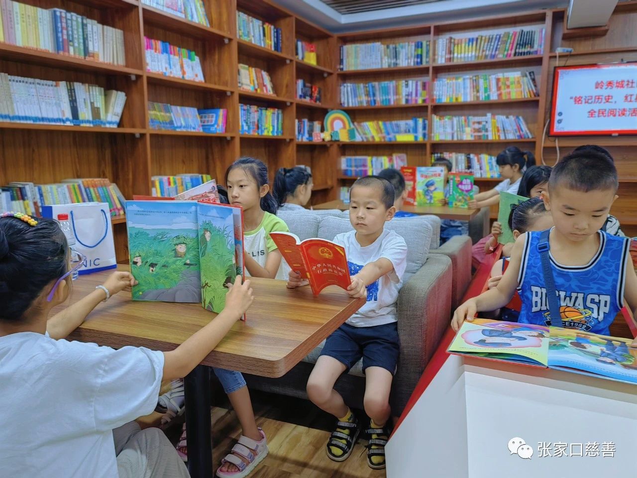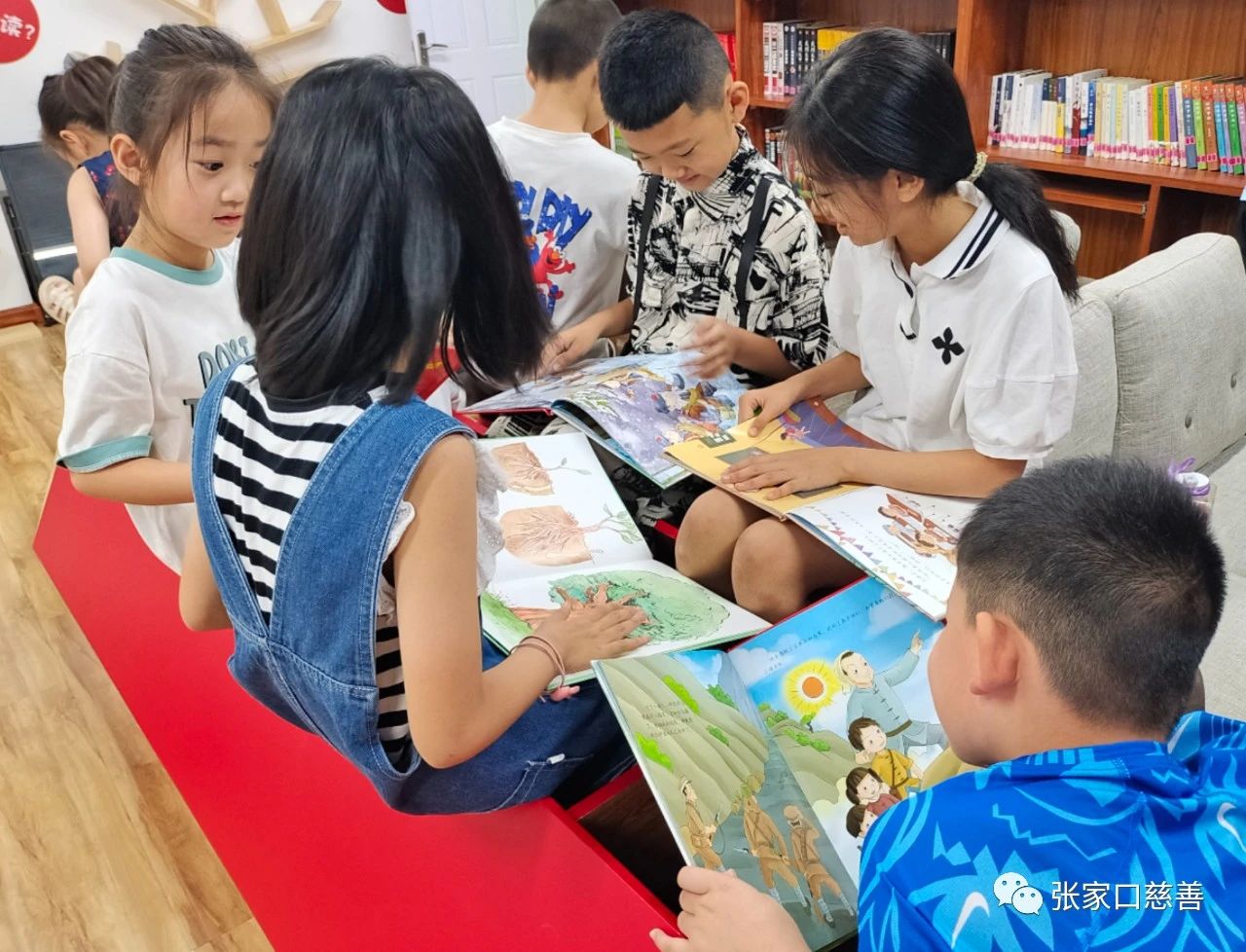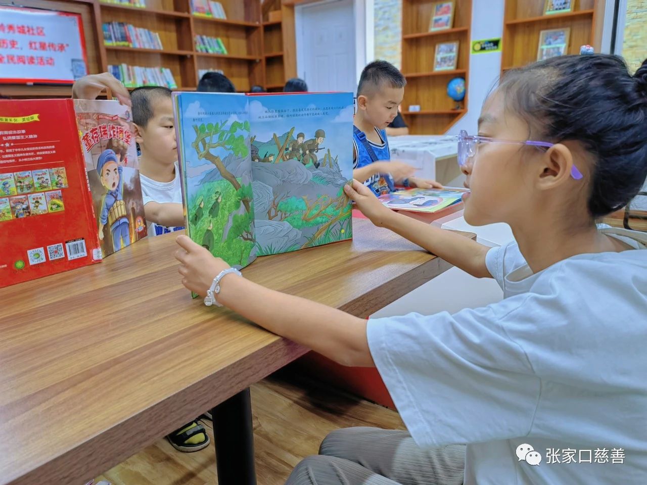 根据青少年年龄段特征,专职老师为大家准备了《少年游击队》、《闪闪的红星》、《雷锋的故事》、《黄继光》、《董存瑞炸碉堡》等多本革命主题读物与绘本。在专职老师的指导下,孩子们从中挑选出自己感兴趣的书籍围桌而坐,不时地交流分享自己的心得体会,享受着阅读的乐趣。