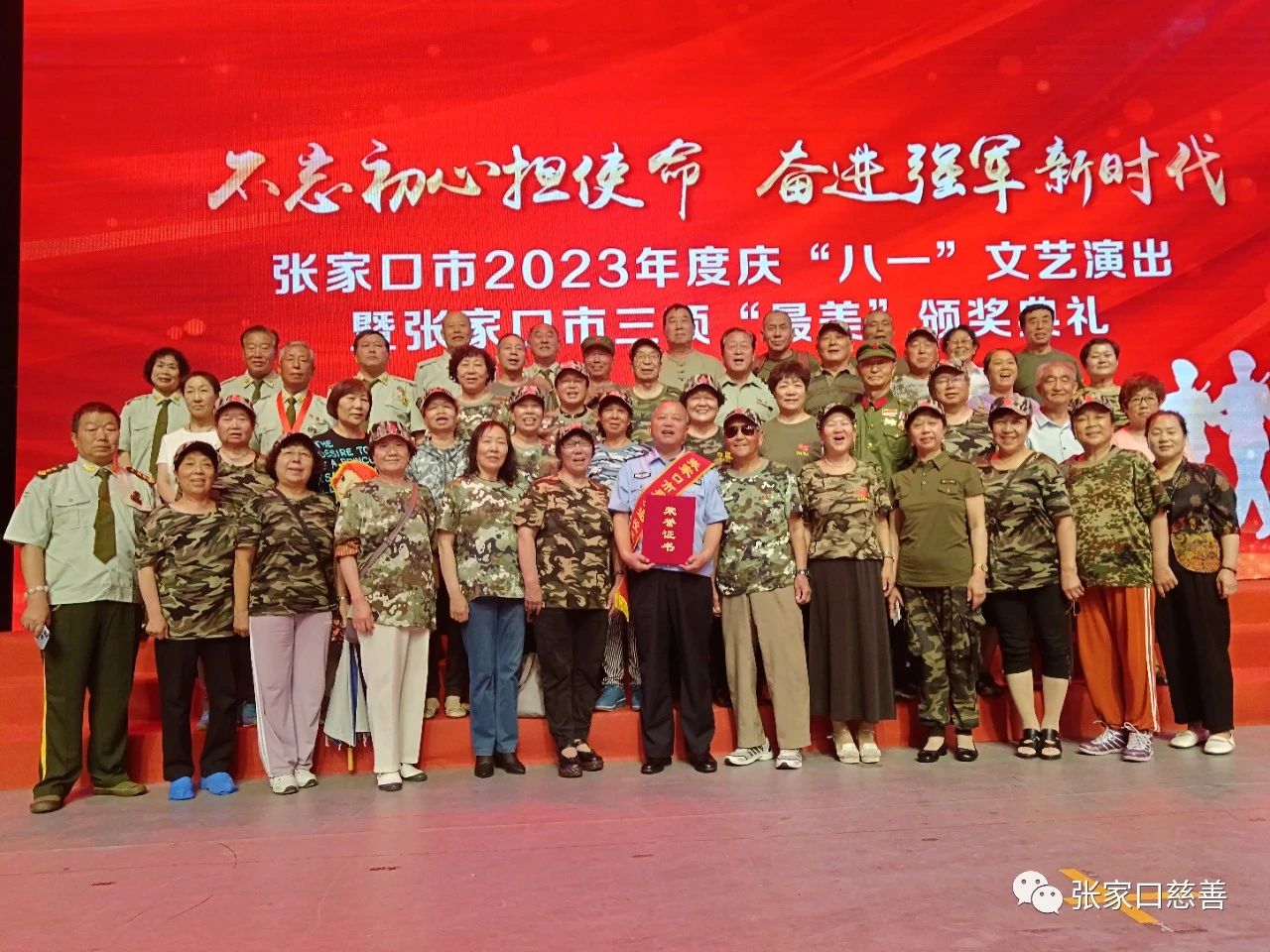 7月31日,由张家口市退役军人事务局举办的“不忘初心担使命· 奋进强军新时代”张家口市2023年度庆“八一”文艺演出暨张家口市三项“最美”颁奖典礼在张家口电视台大演播厅举行。福德仁爱公益队在职党员志愿者、河北省原驻村第一书记、张家口市强制隔离戒毒所教育矫治科科长陈锋胜荣获这次颁奖典礼的“最美退役军人”称号。福德仁爱公益队队长、“张垣之光”禁戒毒志愿服务队队长毛艳芳、“张垣之光”退役军人禁戒毒志愿服务队队长常玉河带领队员参加了这次活动。