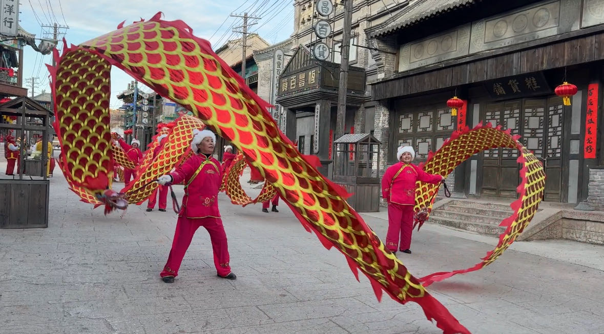 好戏连台,非遗魅力绵延不绝。金黄龙身在光影中腾跃盘旋,鳞片映着红灯笼的光晕,尽显中华儿女的精气神;队员们手持彩棍腾挪跳跃,彩棍在肩头、膝头灵活翻飞,中老年群体的活力风采在每一个舞步中绽放。踩高跷的艺人步履稳健如行云流水,拉旱船的表演诙谐逗趣引得阵阵欢笑,吹糖人、拉丝线的老艺人指尖翻飞,琥珀色的糖稀在寒风中拉出晶莹丝线,转瞬塑造成栩栩如生的生肖造型,让古色古香的商贸街上满是市井烟火气与非遗传承的温度。这些承载着百年记忆的民俗技艺,与基地内清末民初风格的古建筑相映成趣,构成一幅“景中有戏,戏中有年”的新春画卷。