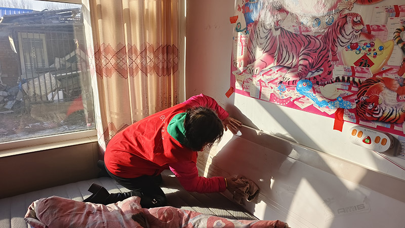 抵达二台子村后,义工们顾不上拂去身上的寒气,直奔五保户家中,迅速投入到志愿服务中。有着多年志愿经验的刘焕林老师心细如发,他一手端着温热的抹布,一手扶着老旧的木柜,从柜门雕花到柜角缝隙,都擦拭得一尘不染。看到老人的被褥堆放凌乱,他又细心地将被褥铺平叠好,还特意把厚棉被放在最上层,叮嘱老人天冷及时添被。一旁的杨志国则主动揽下重活累活,他扛起扫帚清扫庭院里的落叶尘土,又弯腰将角落里堆积的杂物规整分类,遇到沉重的旧木箱,便撸起袖子稳稳搬到墙角。汗水浸湿了他的额发,他却笑着摆摆手说“不累”,转身又拿起拖把,将屋内地面拖得光洁如新。在两人的带动下,马洪花老师也不甘落后,忙着擦拭灶台、整理厨房,大家分工协作、干劲十足,不放过任何卫生死角。从客厅到厨房,从桌面到角落,在义工们的齐心协力下,原本略显杂乱的屋子焕然一新,窗明几净、井然有序。