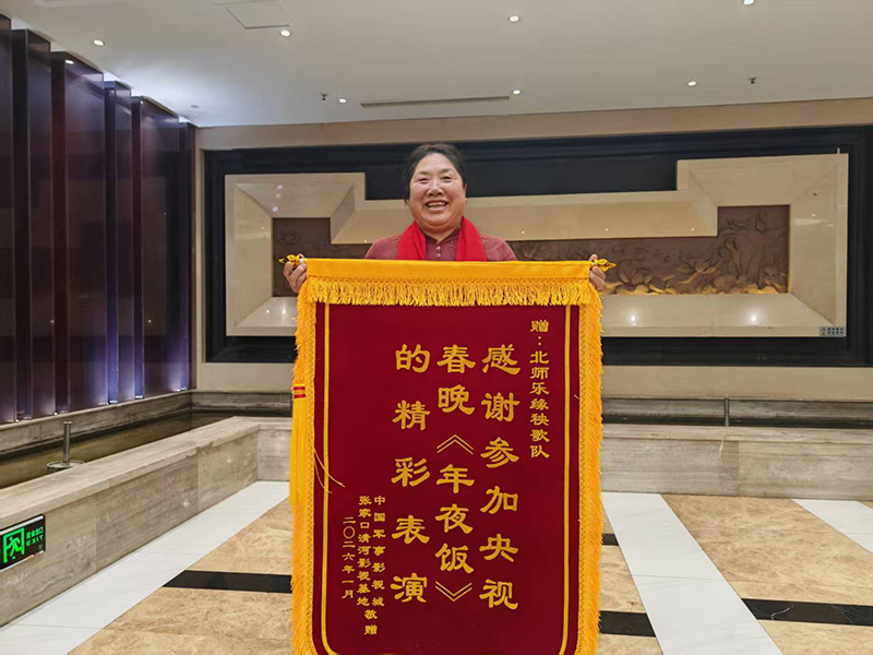 1月23日的张家口清河军事影视基地,寒风裹挟着新春的暖意,一场庄重的锦旗颁授仪式正在这里举行。红色锦旗上“感谢参加央视春晚《年夜饭》的精彩表演”十六个鎏金大字熠熠生辉,清河军事影视基地董事长陈茂岳亲手将这份荣誉递到北师乐缘秧歌队队长李俊连手中,以此表彰这支本土艺术团体在央视春晚《年夜饭》特别节目中作出的突出贡献。掌声中,李俊连紧握锦旗,眼中闪烁着泪光与荣光——这面锦旗,不仅是对一场演出的肯定,更是对非遗传承者坚守与付出的最高礼赞。