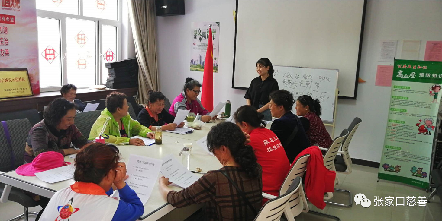 等到社区开门,我们进入到教课的教室,来上课的阿姨们陆续赶来。这次上课,首先带领阿姨们复习了上次的内容,阿姨们都非常踊跃的参与关于学习内容的提问。之后,我们学习了关于礼貌问候的英语用语Good morning,Good night等,我们用英语和阿姨进行了关于所学内容的互动,虽然阿姨们对于英语口语都有些陌生,但依然认真学习,在提问和互动环节都积极参与。主讲人还让阿姨们互相对话,增加了许多乐趣与欢笑。