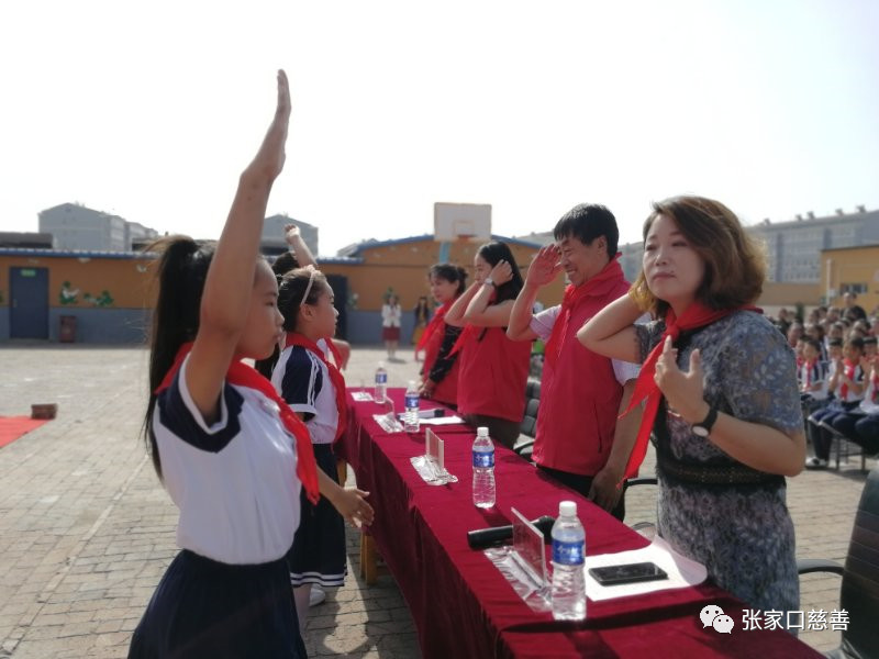 仪式上高庙小学的同学们为主席台出席领导佩戴红领巾,在国歌声中,鲜艳的红领巾垂在胸前,象征着动力和希望。高庙小学的张校长对此次发放仪式表示感谢,希望同学们可以积极学习,回报祖国,经开区慈善义工联副会长马宏燕也对大家寄予厚望并表示将在今后积极关注大家,并通过团队共同努力,帮助大家。