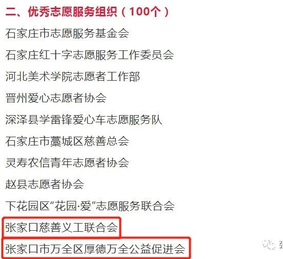 其中桥东区慈善义工联合会 任大龙、厚德万全公益促进会 张秀娟入选优秀志愿者;张家口慈善义工联合会、厚德万全公益促进会入选先进志愿服务组织;冬奥英语志愿服务项目、厚德万全“节日零垃圾”宣传环保活动入选优秀志愿服务项目;经开区南站街道世纪路社区入选优秀志愿服务社区。