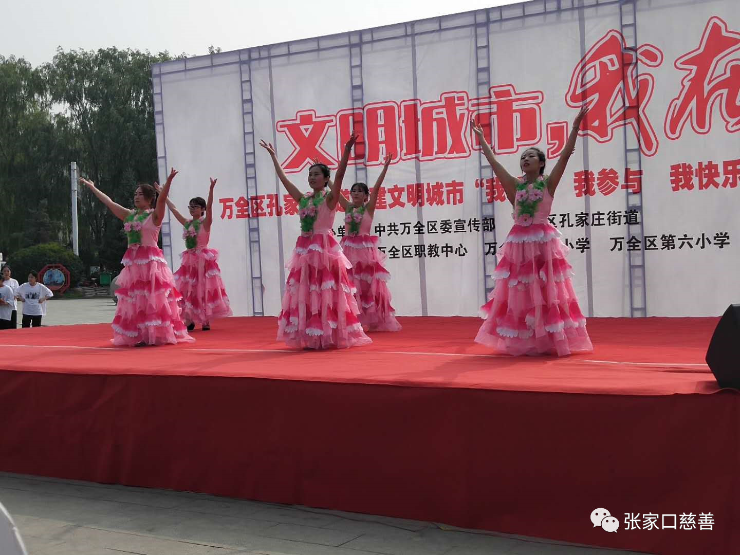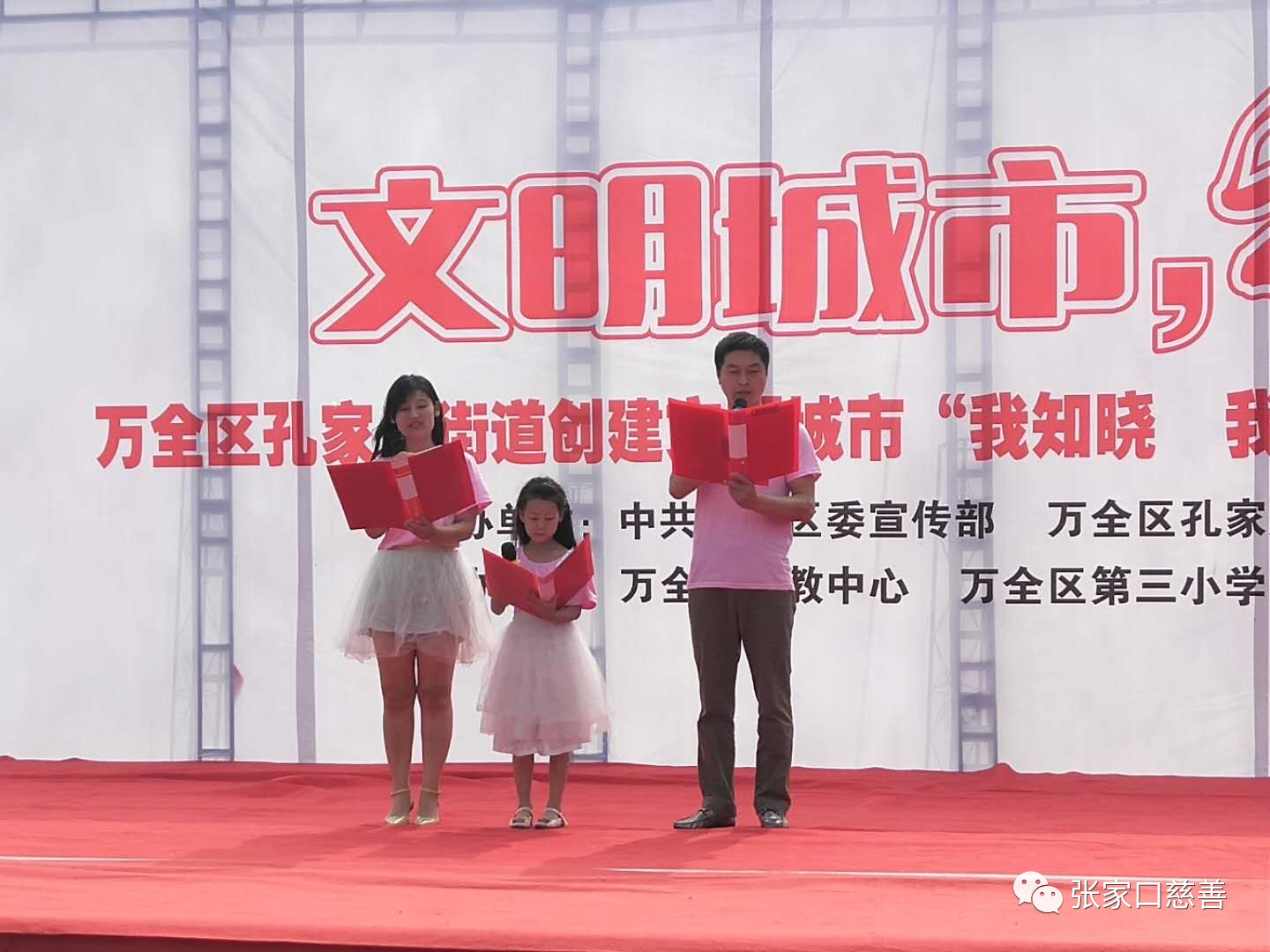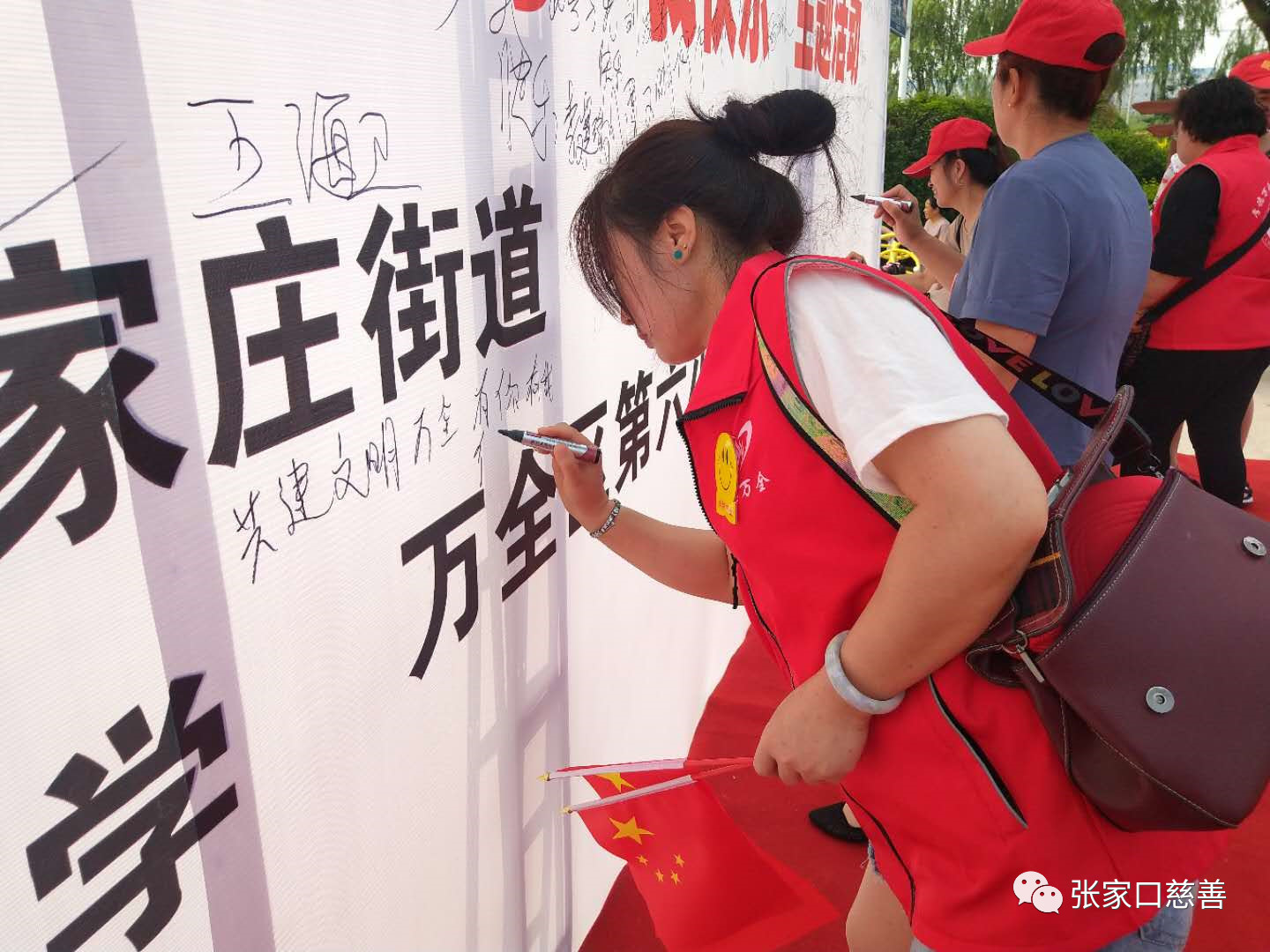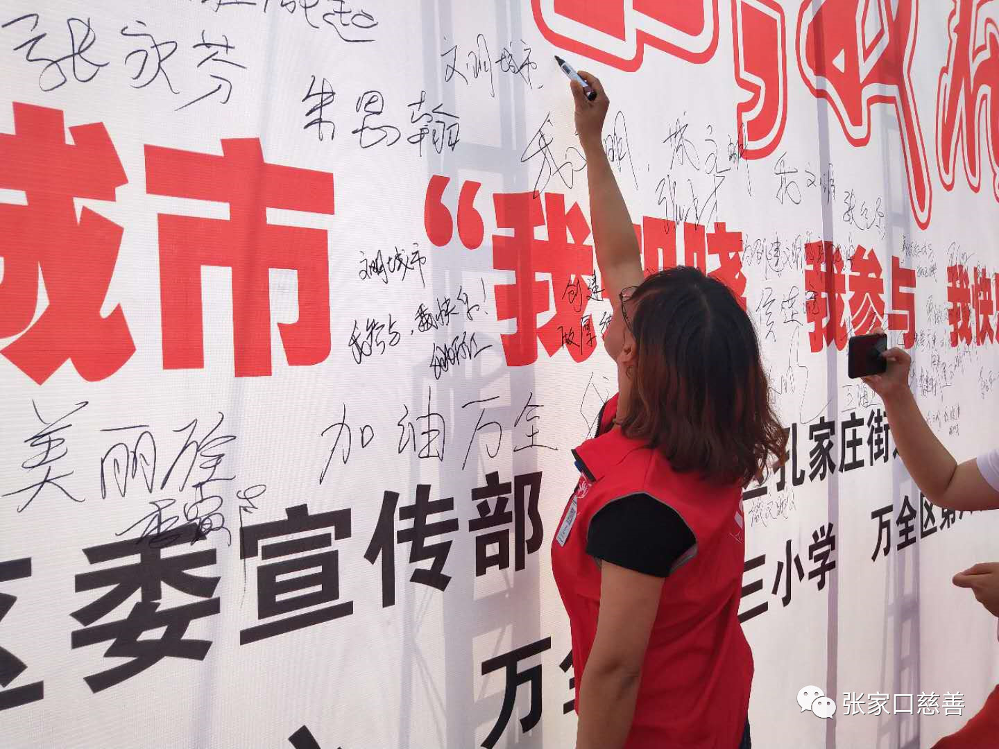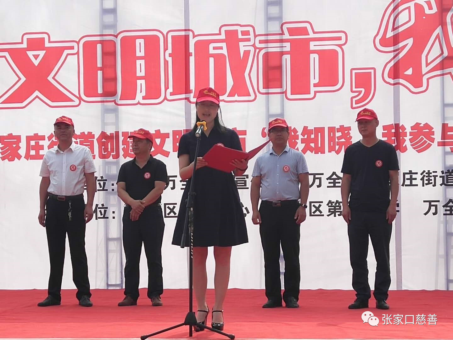 手拉手传递共同心声,心连心推动文明进程。为积极响应6月11日万全区举行的创建省级文明城区、助力张家口市创建全国文明城市“十大专项行动”誓师大会号召,掀起新一轮创建文明城市热潮。2019年6月22日,由区委宣传部和万全区孔家庄街道联合主办的创建文明城市“我知晓 我参与 我快乐”主题活动在东环佳馨广场举行。出席本次活动的领导有区委常委 区政府副区长 杨琳、区委宣传部 常务副部长 王俊飞、区委党校副校长 李海峰、孔家庄街道党委书记 李继海、孔家庄街道办事处主任 张晓东。厚德万全公益促进会执行理事长张玉冬,妇联主席王海燕、副主席姚万红,工会副主席董克思,理事徐云秀、朱红霞,会员马红丽、王重霞,张会东等志愿者参加了此次活动。