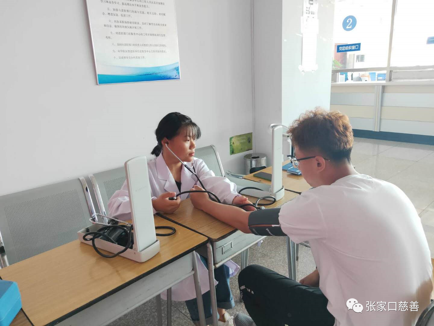 参军报国既是磨砺人生、实现理想抱负的重要途径,又是热爱祖国的高尚行为。2019年6月,张家口桥西区人民政府征兵办公室向我院发放了征兵宣传册。为响应这次征兵活动,张家口大学生医学志愿者服务队的志愿者们分别在6月19日和6月20日帮助张家口学院的大学生进行征兵体检。