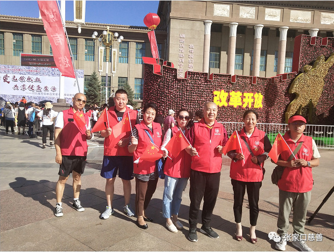 2019年6月14日在文化广场,在快闪《我和我的祖国》深情悠扬的歌声中,这个无偿献血日,我们庆祝第16个世界献血者日暨河北省无偿献血荣誉卡发放(启动)仪式。张家口市卫生健康委员会计生协会秘书长钱继红,市红十字会会长岳建宇,市自然资源和规划局副局长冯雅男,市文化广电和旅游局副局长许亚林,市新闻中心党委委员、张家口市日报社副总编辑杨秀云,市财政局社保处处长李春艾,市交通运输局工会主席高义众,市城市管理综合行政执法局、机关党委专职副书记张晓明,市水务局机关党委专职副书记胡胜华,张家口市血站站长张晓飞莅临这次颁奖活动。张家口慈善义工联合会同心携手为爱传递义工队、巅峰爱心车队、张垣博爱志愿者团队、阳光行关注历史志愿者团队、让爱飞翔志愿者团队、雷锋精神志愿者服务队80余人。