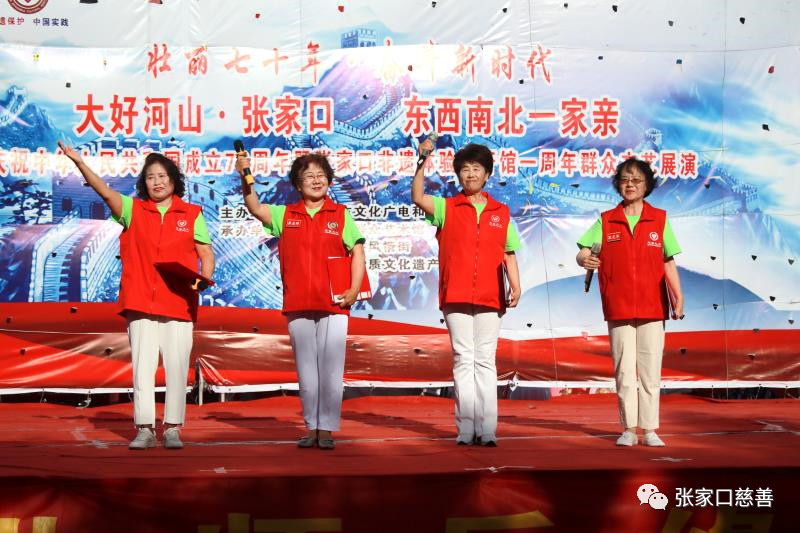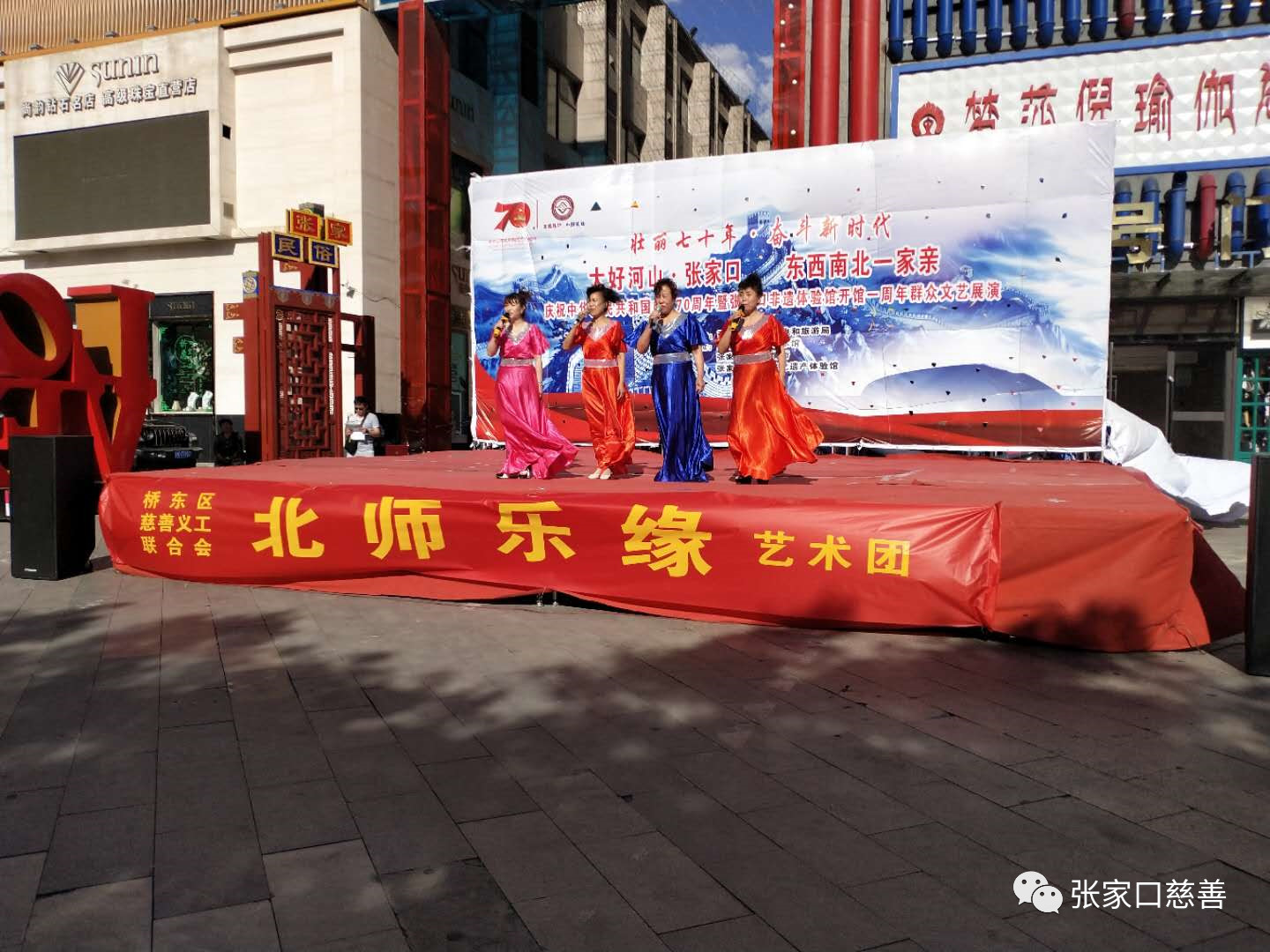6月13日下午,北师乐缘义工队艺术团耿光华、李亚萍、任建萍、陈润林四位老师代表北师乐缘义工队参加了由市文化广电和旅游局在尚峰广场举的“壮丽70年 奋斗新时代 大好河山张家口东西南北一家亲 庆祝中华人民共和国成立70周年暨张家口非遗体验馆开馆一周年群众文艺展演”文化惠民专场文艺汇演。