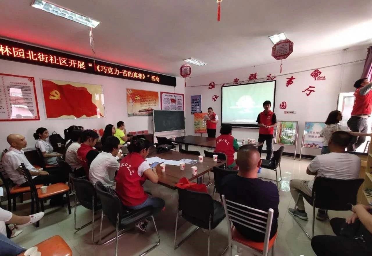 2019年6月12日周三,志愿者王晗、赵春红、马静、张荣玻、张英杰前往林园北社区观看《巧克力-苦的真相》,放映前,崔老师简单介绍了一下巧克力的种类,成分等。