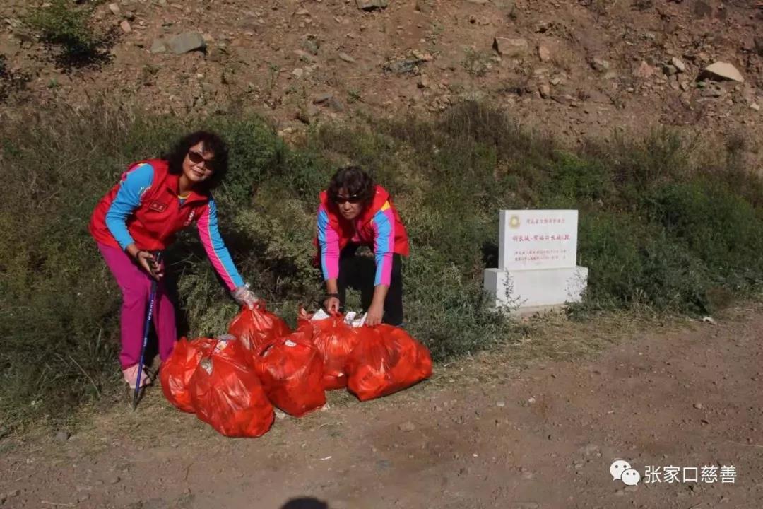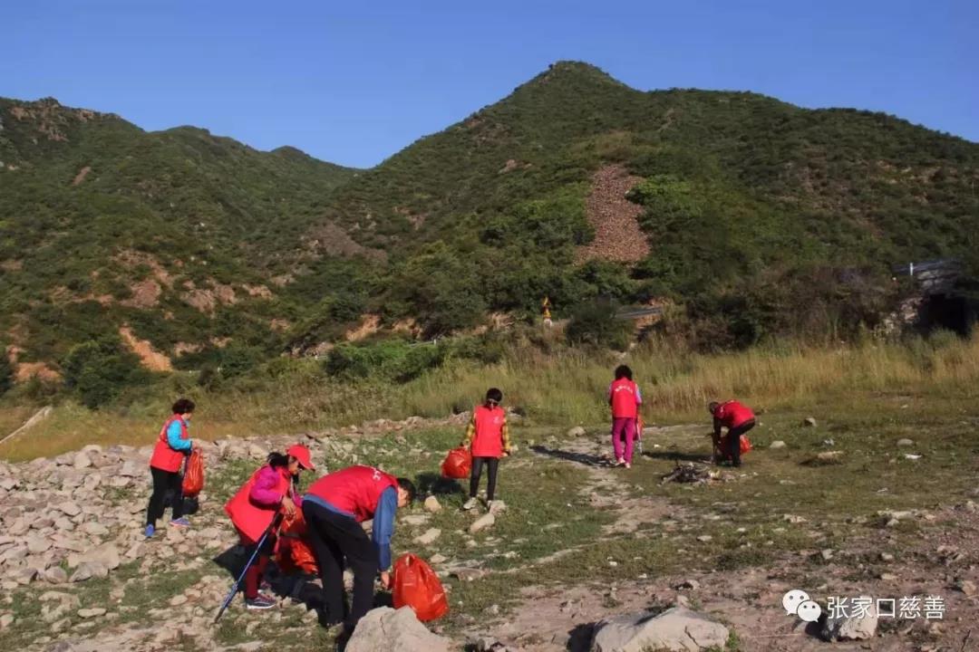 一早队员们驱车从张家口出发,前往第一站——常峪口长城。7点半左右到达目的地。这段长城在常峪口水库附近,其中一段遗址在水库下面,东、西两面山上段长城风化坍塌比较严重。大家进入巡查位置,把周边的垃圾拾捡收集起来,统一清倒。