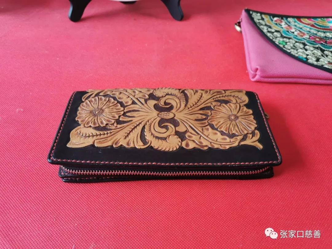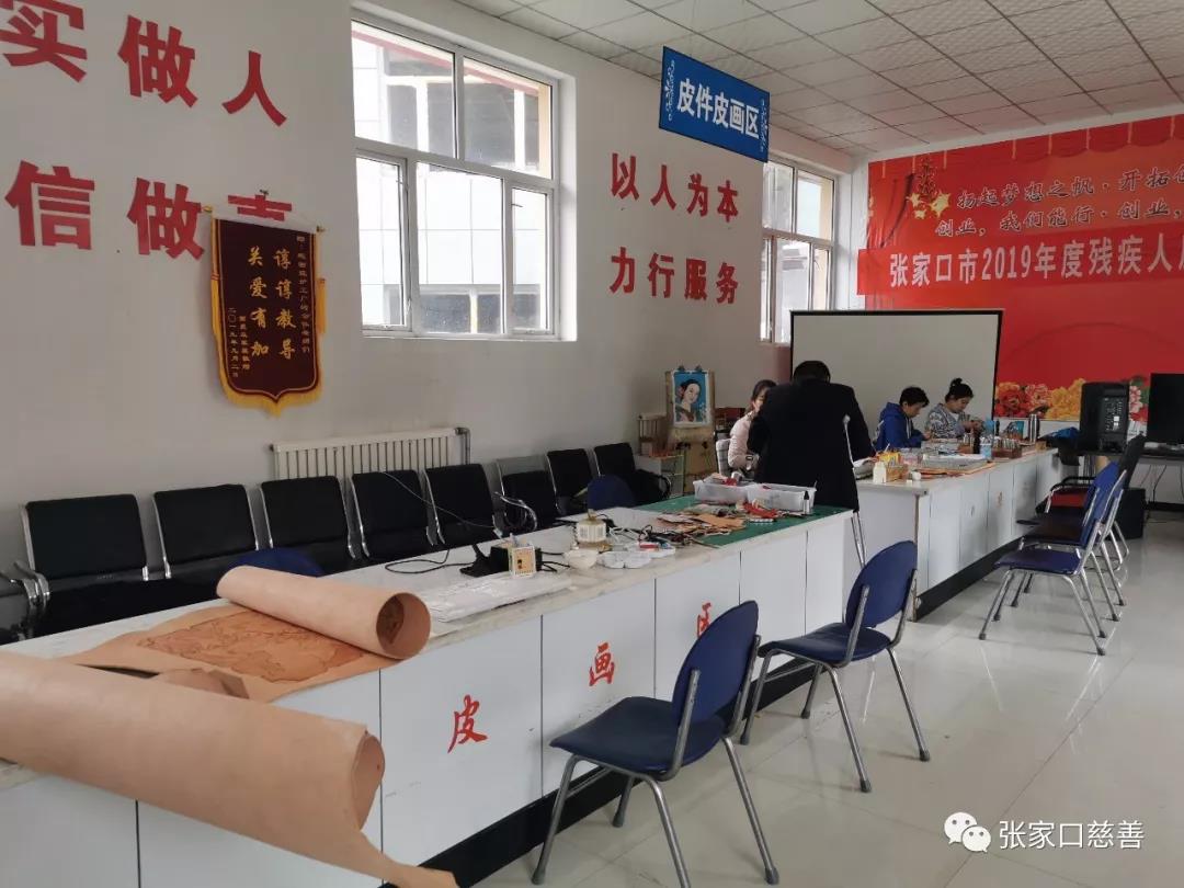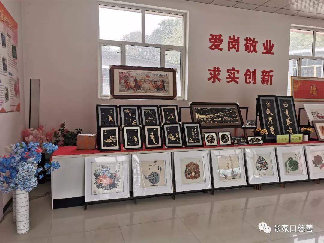 下图:学员手工制品展示区(包裹麦秸画,绢花,特色雕皮画,手工皮具,无纺布手袋…)