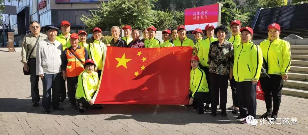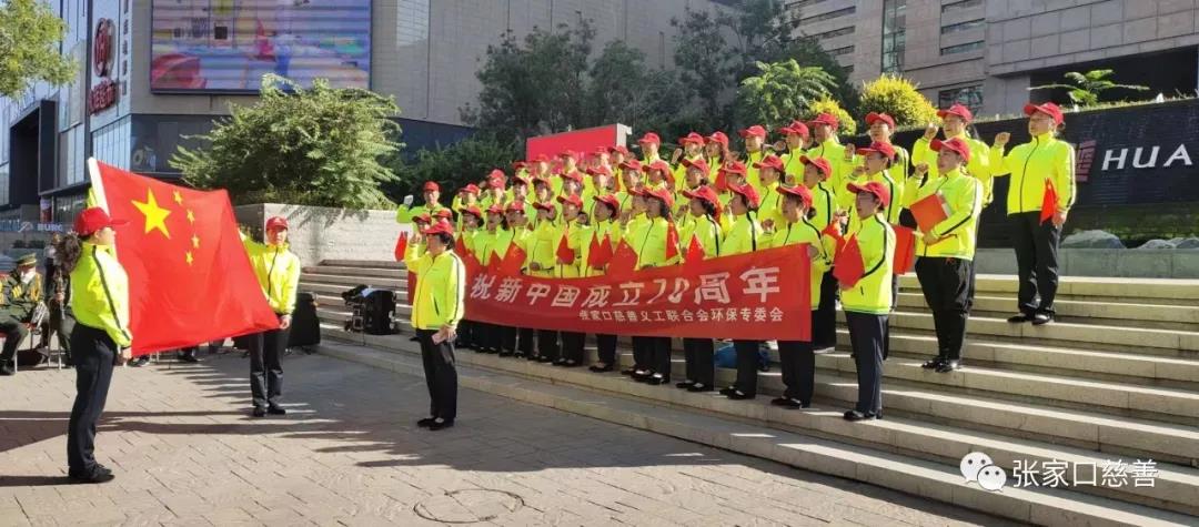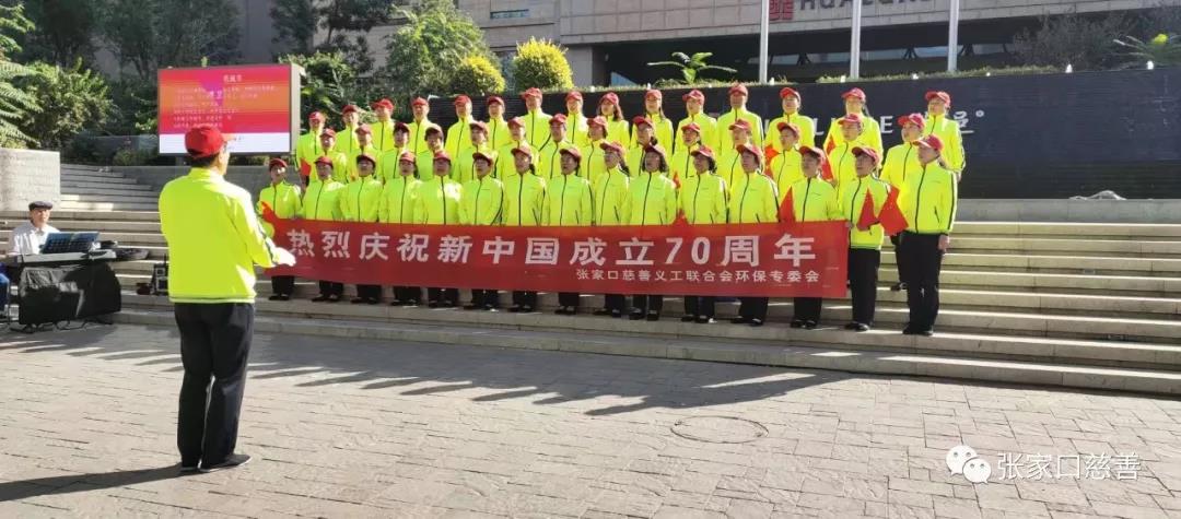为庆祝中华人民共和国成立70周年。9月25日上午九点,张家口慈善义工联合会环保专委会黄丝带志愿者百余名老师,在华邑酒店广场举办迎“国庆唱红歌”活动。张家口日报、张家口晚报、张家口电视台等媒体应邀参加了活动。志愿者老师们满怀激情,郑重的举起右拳。