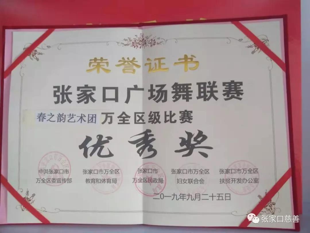为丰富全区广大群众业余生活,增强生活幸福感,提升幸福指数,在热烈庆祝中华人民共和国成立70周年之际,2019年9月26日,万全区委宣传部、区教体局、区妇联、区民政局、区扶贫办联合举办“我和我的祖国”2019年广场舞比赛。春之韵义工队16人参加张家口市万全区广场舞比赛,并获得优秀奖。