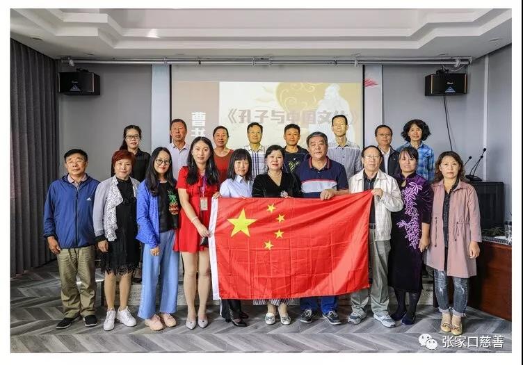 讲座结束,部分听众和曹老师与国旗合影。