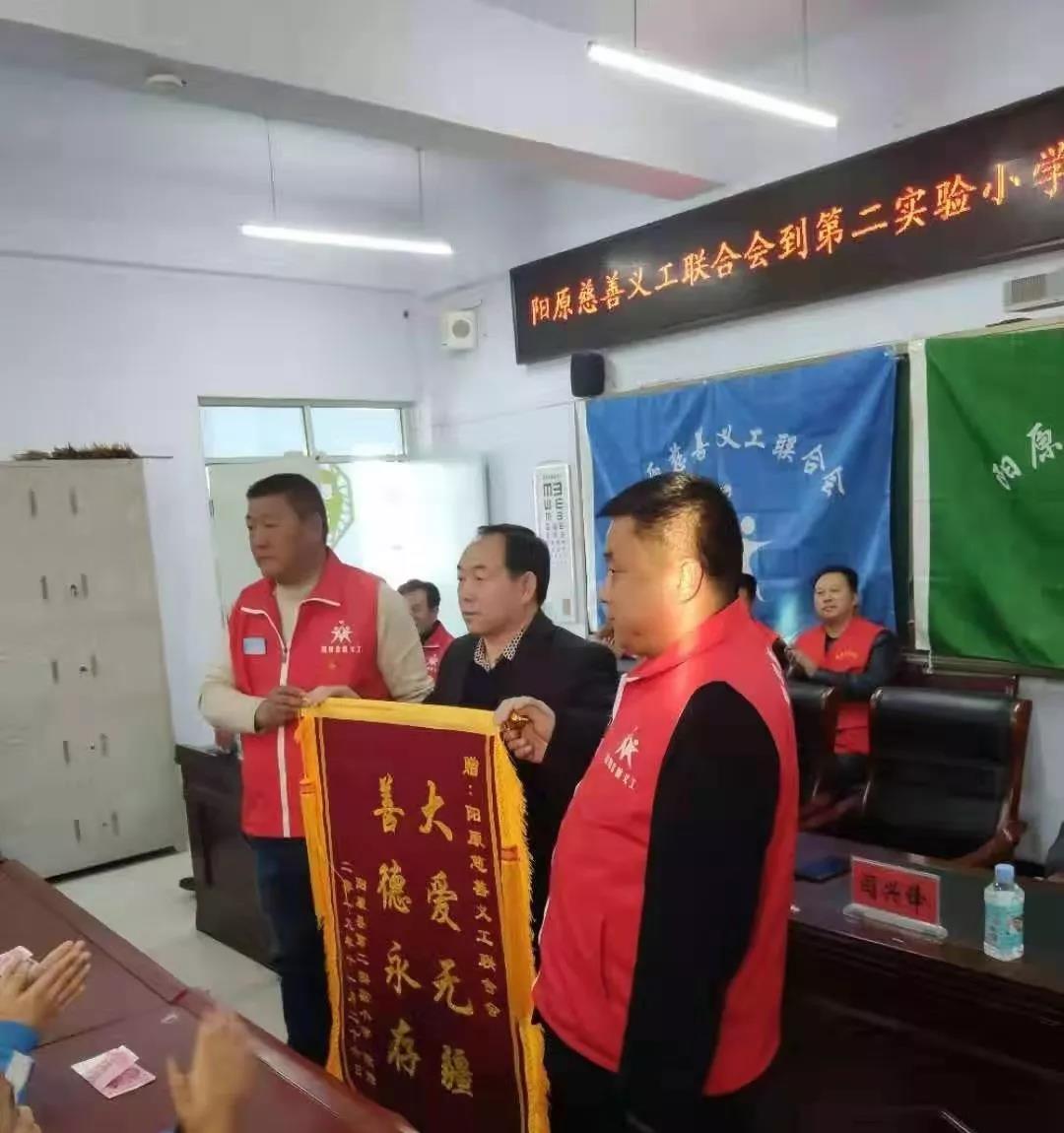 随后,举行了助学金发放仪式,李建军校长为阳原慈善义工联合会赠送了锦旗,副会长路贵祥、闫兴锋接过锦旗后,会场爆发出阵阵掌声。