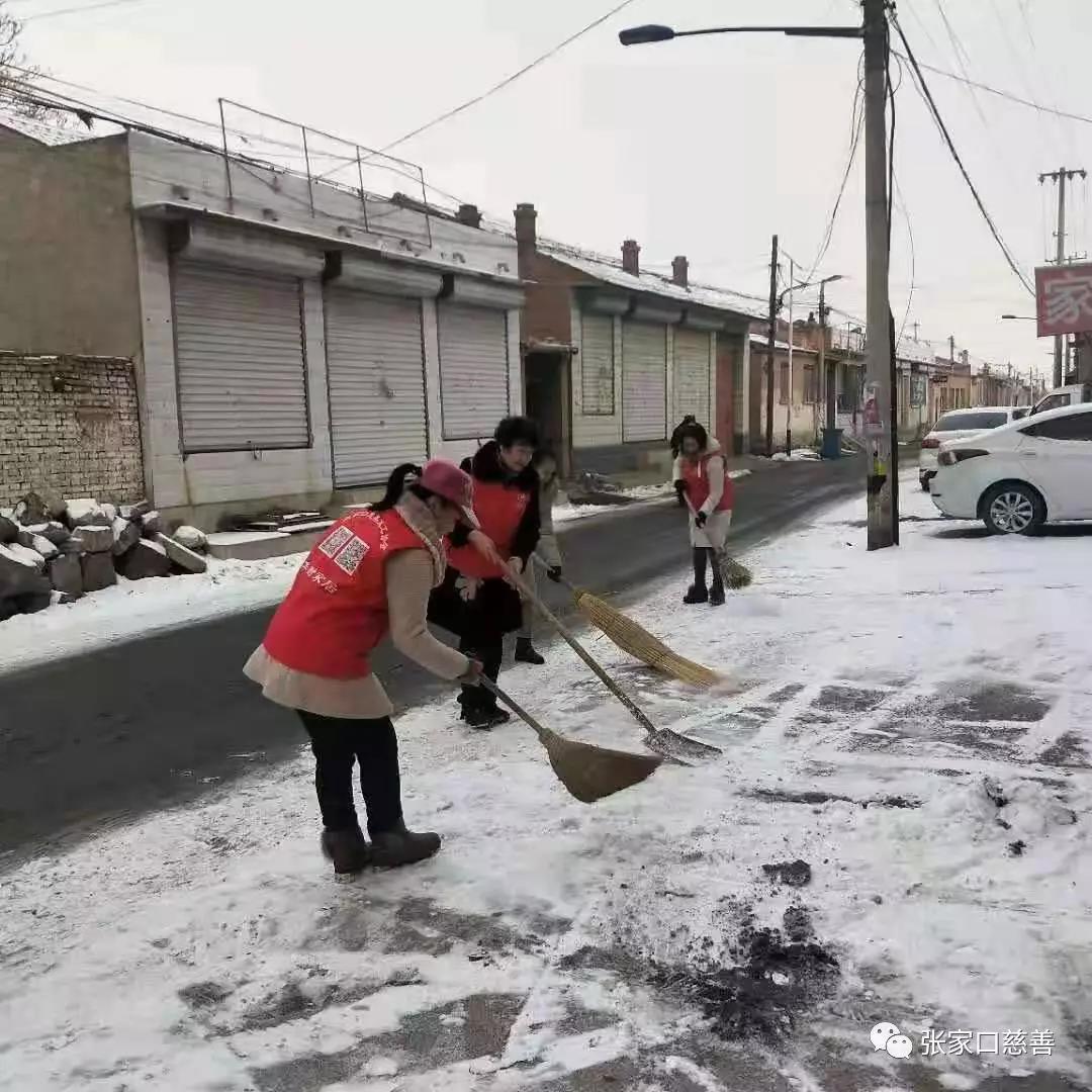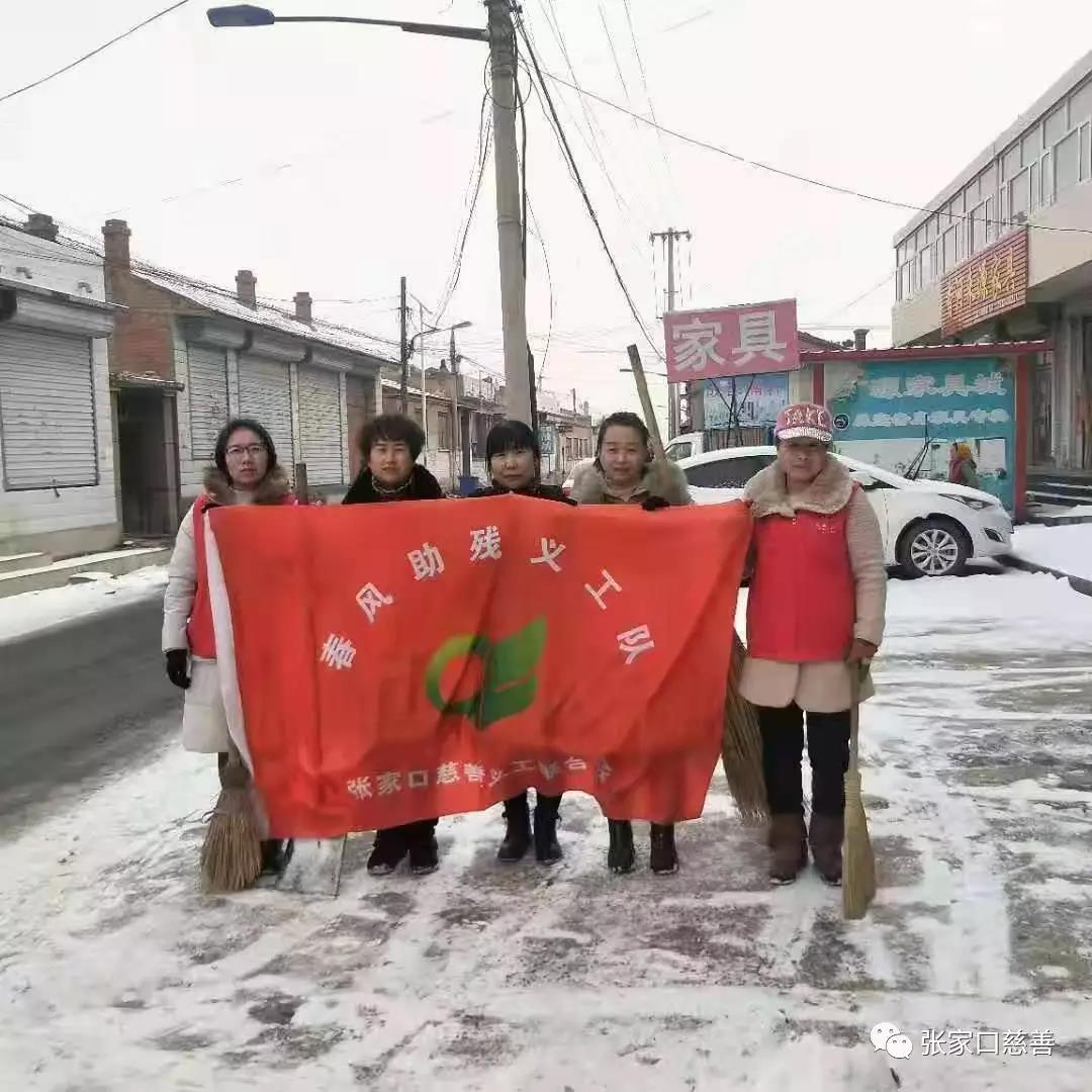 为响应张家口市政府号召,不忘初心,牢记使命,张家口慈善联合会春风助残义工为张家口市民出行保驾护航开展了除雪活动!2019年12月16日下午二点,在副队长王晓梅的指挥下,由王秀英带队在张家口市左卫镇金泉街和步行街开展了铲雪活动,春风队的队友们急匆匆的投身于铲雪的大战中,忙碌的身影,寒风中冻的通红的脸庞,温暖了在这个街道出行的每个人,成为金泉街和步行街寒风中一道靓丽的风景线!