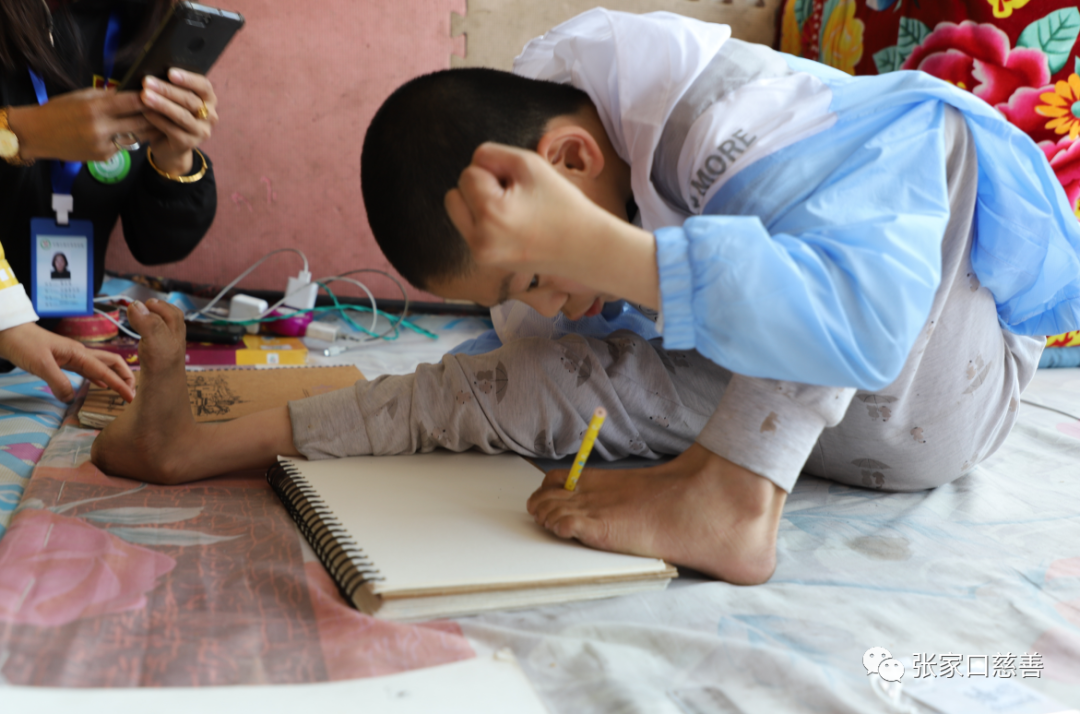 小柴虽然残疾,但是特别聪明,而且非常有绘画天赋,因脑瘫导致大部分身体无法正常活动,凭着自己的毅力用脚趾头夹笔画画,没有老师,靠着姐姐教的拼音,认识了几百个字,平时就用手机看一些关于绘画方面的软件来掌握绘画技巧。他的这部手机还是别人不用了给他的,而他当宝贝似的珍惜。本次一起随行的爱心企业家张昊通过志愿者们提前了解情况后,为孩子送了一部新手机。手机送到小柴面前的一刻,这个突然的惊喜让他及家人感动的热泪盈眶,我们看着他用唯一那只可以自如控制的脚把手机开启,我们都为这个阳光的小男子汉泪目。