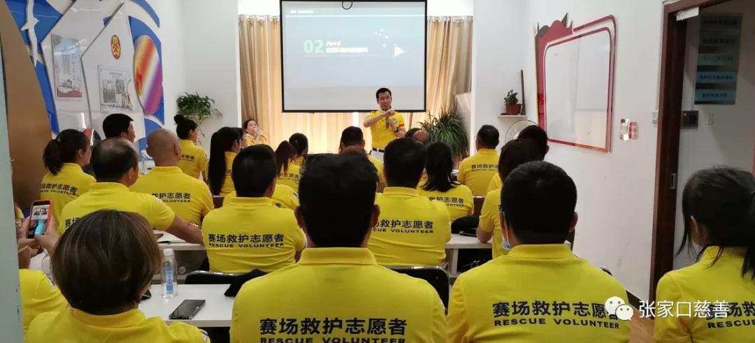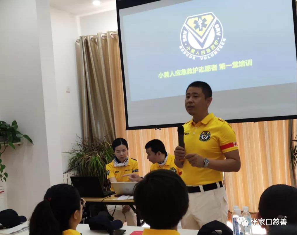 参加深圳小黄人应急救护中心第一期培训,持有双证的优秀队员,经过多次复训,并经过为北京“热血跑沸京城”赛事做应急救护保障,为深圳国际马拉松赛事做应急救护保障的锻炼,表现优秀的武亭亭、臧沙沙、孙文、易卫东、杨素英、郑佳楠6位队员选拔为候选导师。6月11日、12日,6位候选导师在北京经美国心脏协会(AHA)国际救护主任导师理论考核成绩合格后,6月13日,美国心脏协会(AHA)国际救护主任导师张元春、赵宇两位导师从北京来到张家口进行辅导。候选导师分为两组,为26名新队员开展了美国心脏协会(AHA)国际救护应急救护资格的培训。6位AHA候选导师对26位新学员的培训,也是他们作为由候选导师取得正式导师资格的实操考核。