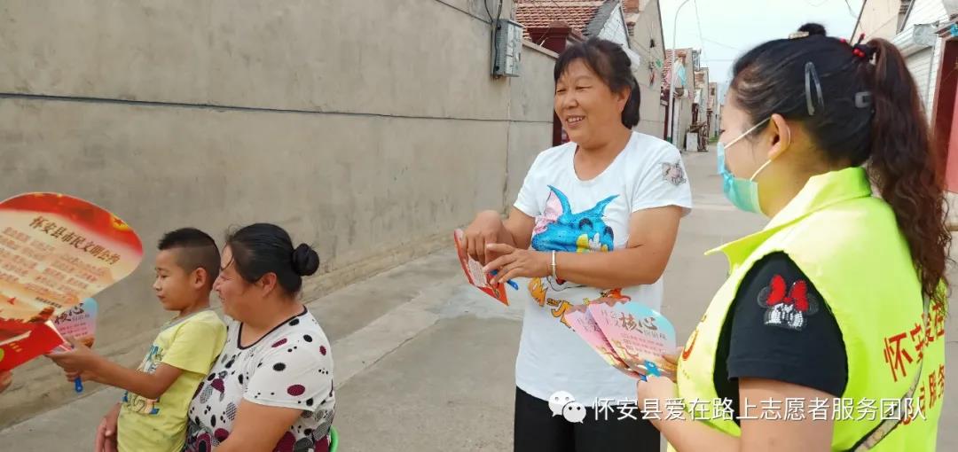为持续深入推进怀安县文明城市创建工作,8月6日上午,怀安县爱在路上志愿者服务团队来到柴沟堡镇富民沟村,开展“创建文明城市进城乡”活动,志愿者们走街串巷,通过向村民发放人民城市创建、你我携手同行倡议书和宣传扇,宣传创城知识,并耐心讲解创城的重要意义与相关知识。