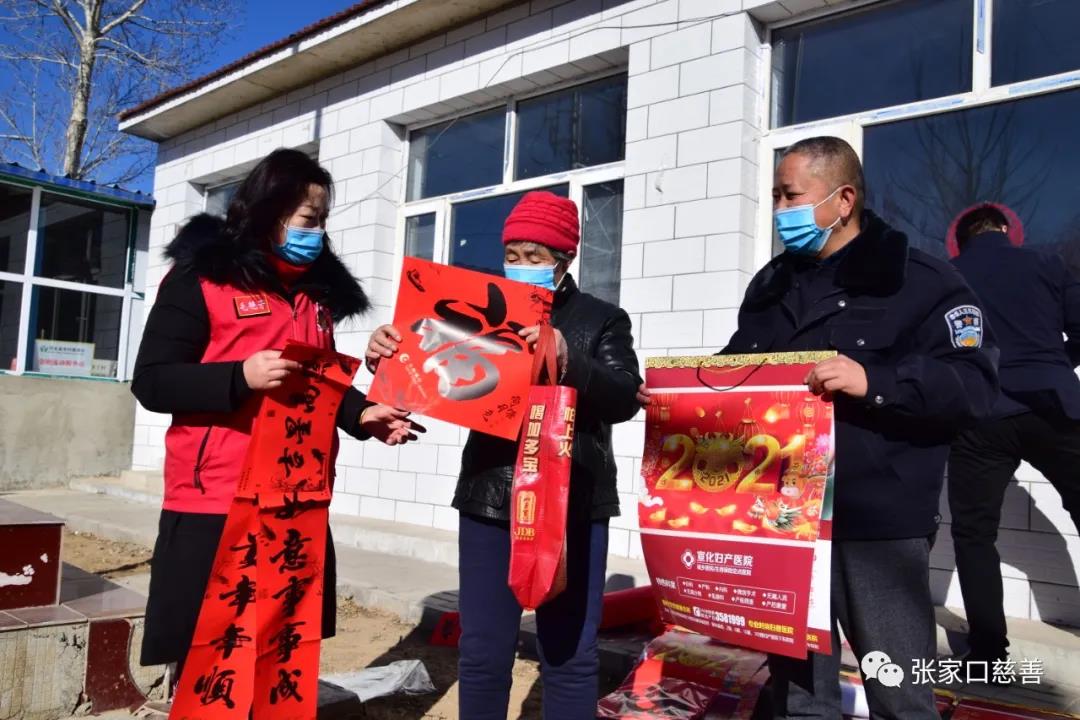 捐赠物资包括山庄老酒张家口办事处总经理申大军赞助的价值4000余元的防疫酒精,承德银行张家口分行赞助的新春对联120副,张家口慈善义工联合会文化发展专委会为赠送的手写春联40副和宣化区公益时代社会服务中心提供的挂历90本。
