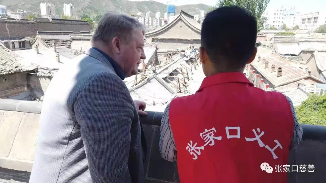 6月3日,张家口文物保护慈善义工队队长苏景与文保义工们走在堡子里的街道,同行的还有一位德国友人墨轲博士与张家口电视台冬奥栏目的工作人员。这次的文物巡查多了一个任务,就是在节目中为德国友人讲述张家口堡子里的故事,大家先后查看了文昌阁,察哈尔财政厅,抡才书院等国家重点保护院落,苏景会长不仅同墨轲博士聊堡子里文物的故事,更多的是与国际友人一起感受堡子里居民的生活。