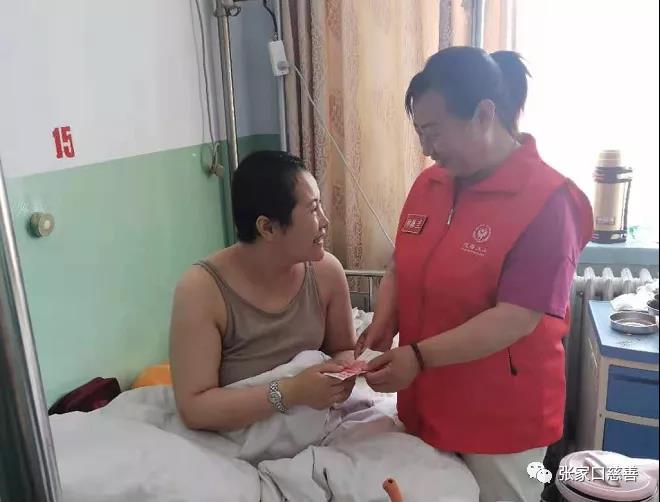 6月19日上午,阳原春风送暖爱心队王宏君、庞玉娥等一行五人在队长帅振兰带领下,来到阳原县中医院看望了身患重疾的队员王丽娟,她在术后恢复休养期间,不慎把腿摔折了,她每天忍受着身体疾病和伤痛的折磨,坚持献爱心,她几年如一日,坚持每天发善包,日行一善是她最大的快乐。王丽娟虽然是个单亲家庭,又身患重病,但是她还是坚持做善事,她那种坚强不屈的精神真是我们学习的榜样。对于我们的到来,她表示非常感激,她开朗、欢快的心情让大家感觉到非常欣慰。