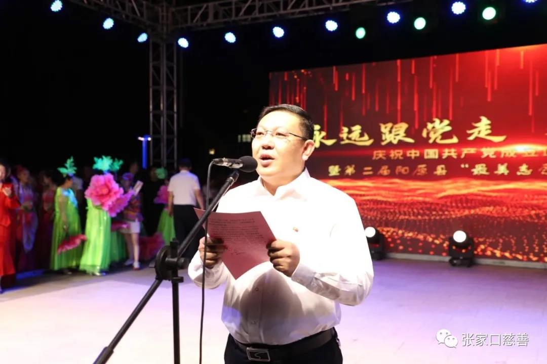 6月30日晚,阳原慈善义工联合会在县泥河湾广场隆重举办庆祝中国共产党成立100周年文艺晚会暨第二届阳原县“最美志愿者”颁奖盛典,为观众提供了一道精美丰富的“文化大餐”。整场晚会融合歌舞、朗诵、合唱、表演唱等形式,紧紧围绕歌颂党、歌颂祖国,歌颂时代等内容,规模宏大,精彩纷呈,展现了阳原县广大党员、群众和志愿者坚定理想信念、勇担初心使命的精神风貌。