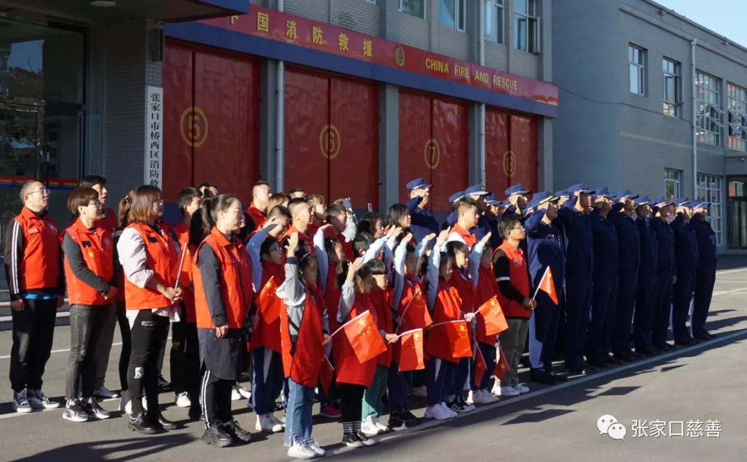 10月1日早上8点,张家口桥西区消防救援大队,中共张家口慈善义工联合会第四支部委员会、张家口红旗楼小学雷锋分队,庆祝中华人民共和国成立72周年升国旗仪式在桥西区消防救援大队院内举行。20余名志愿者,30余名消防官兵,20余名师生代表庄严肃立,满怀激情,用升国旗的方式表达对祖国的热爱和祝福。