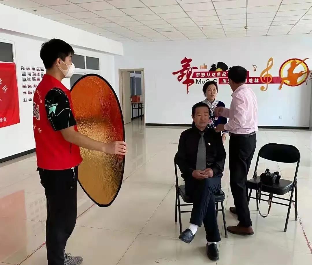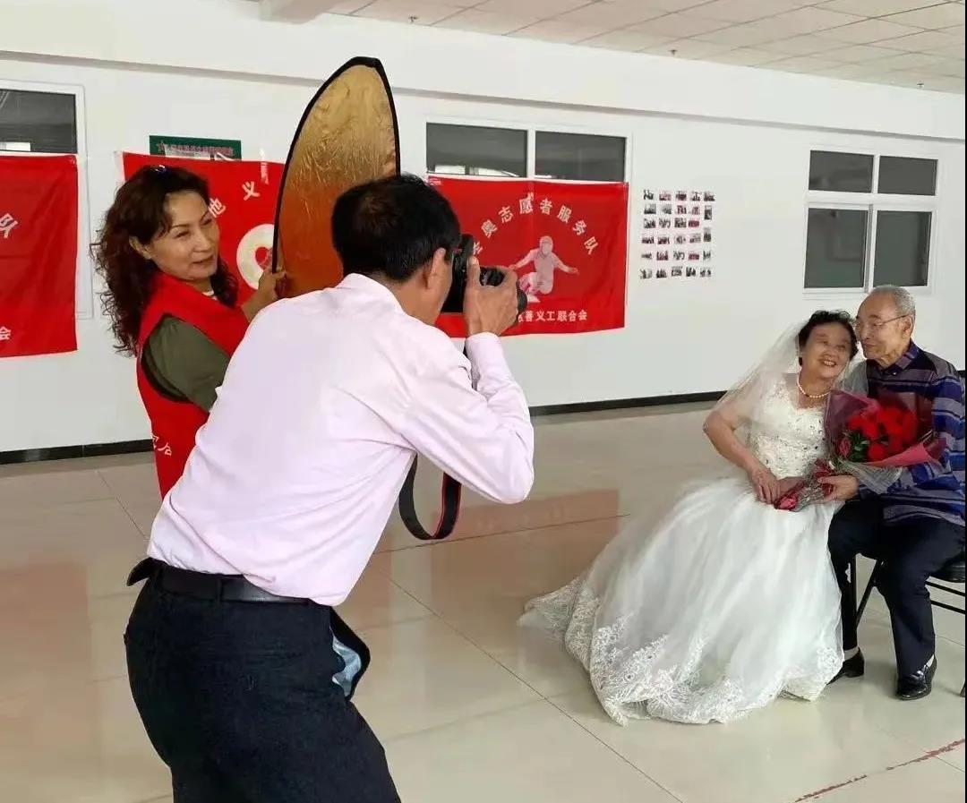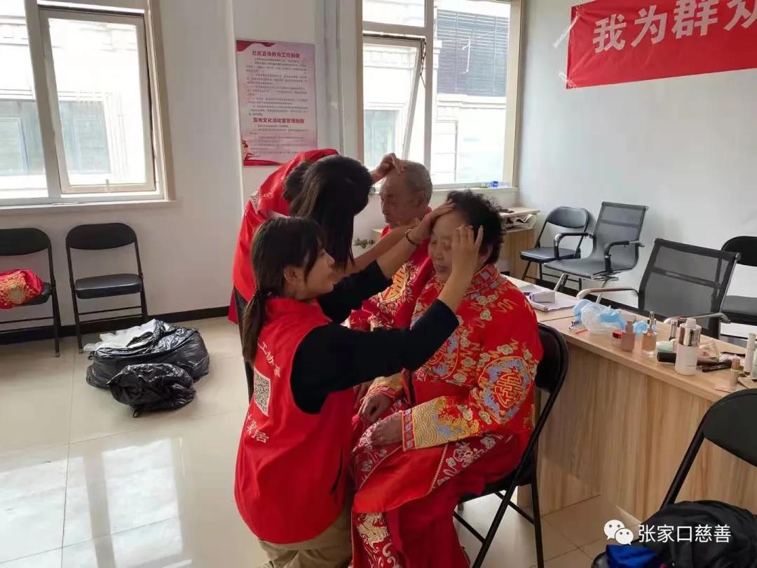 负责服装的助老志愿者,热心的给老人们推荐合适的礼服和婚纱,并帮他们穿戴整齐。张家口慈善义工联合会大学生专委会为老人化妆。来自前进照像馆的特级摄影师——马克珍,诙谐幽默、风度翩翩,给老人们设计各种姿势,描绘画面,讲解眼神的方向。似乎又回到了那个妙龄少女和翩翩少年的年纪,彼此深情注视,双手紧握,似乎在述说着几十年的风雨历程、携手相伴。