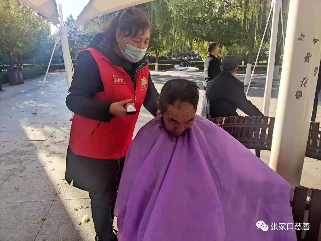 2021年10月21日,阳原雷锋理发队和春风送暖队八名志愿者在泥河湾文化广场一角为百姓理发。