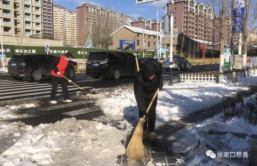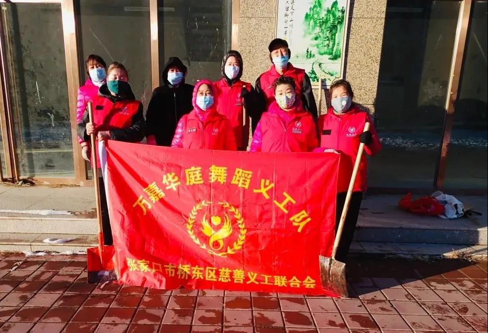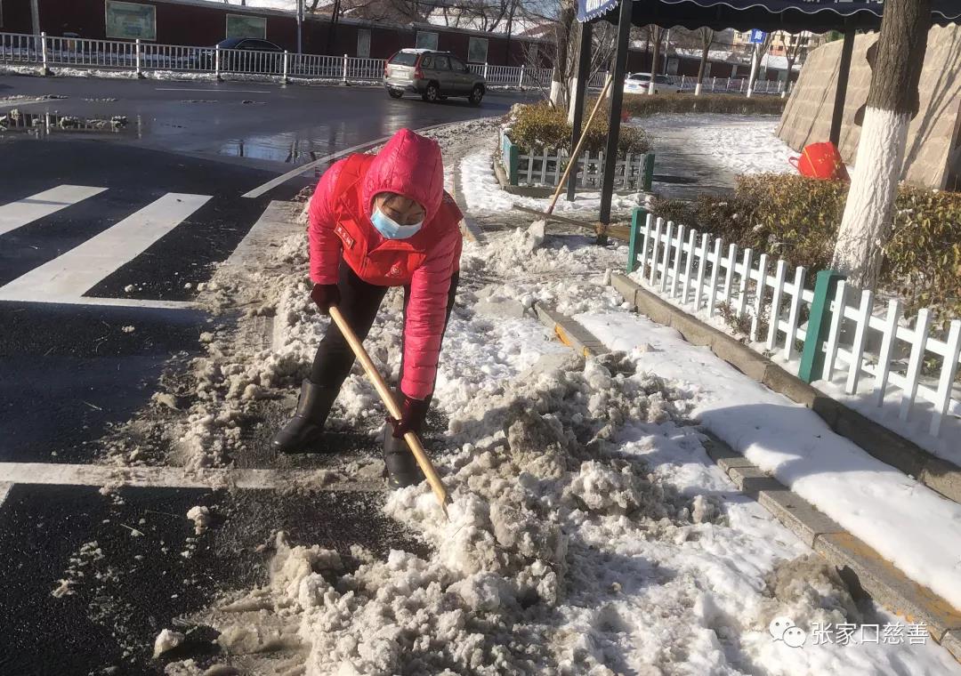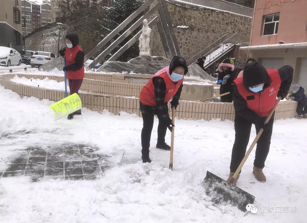 万嘉华庭舞蹈义工队队长冀生梅积极响应张家口慈善义工联合会号召立即组织全队人员积极配合万嘉社区书记王晓兰、朱广艳及工作人员,在小区院内展开了除冰铲雪活动,大家不畏严寒,铲的铲,扫的扫配合默契,干得热火朝天,志愿者的精神和热情深深地影响到居民,居民也参与进来,很快把小区的主干道和各栋楼的人行道清扫出一条条安全通道。