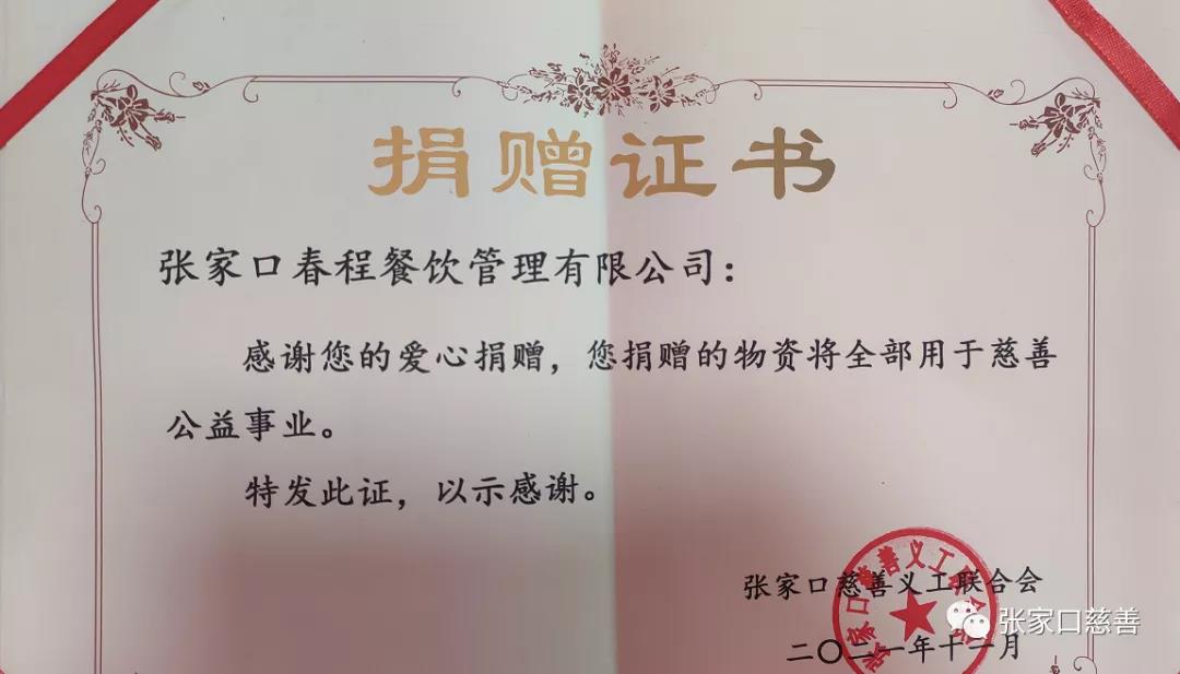 2021年11月15日,春程餐饮管理有限公司为张家口慈善义工联合会捐赠一批义工马甲。一直以来,春程餐饮管理有限公司积极投身于慈善志愿服务,为社会作出相应的贡献。这次,在了解到张家口慈善义工联合会义工马甲数量有所欠缺,部分马甲出现破损的情况,春程餐饮管理有限公司火速为张家口慈善义工联合会捐赠马甲,为志愿事业续上“红色火苗”。
